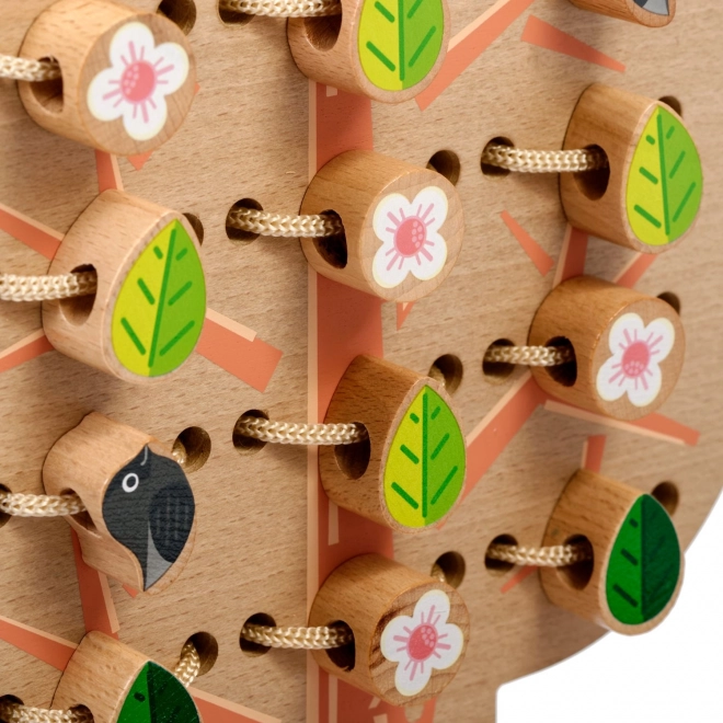 Este set de madera de calidad ofrece a los niños un juego entretenido de enhebrar y enlazar en una sólida placa con forma de árbol y soporte. Incluye piezas de colores (hojas, flores, bayas, bellotas, frutas, copos de nieve, insectos, etc.) y varios cordones para infinitas combinaciones. Tras el juego, las piezas pueden guardarse en la práctica bolsa de lino.