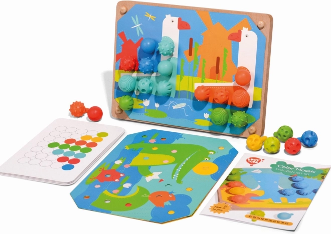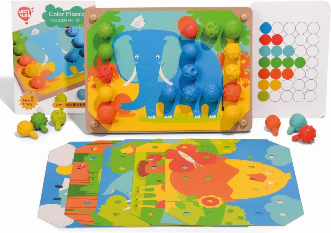 El mosaico y bordado es una excelente herramienta para que los más pequeños desarrollen habilidades de motricidad fina y su creatividad. Incluye 35 clavijas grandes de silicona en siete colores vibrantes, que los niños pueden usar para completar las plantillas de colores. El set también incluye 12 imágenes a color con animales y 6 plantillas de doble cara.