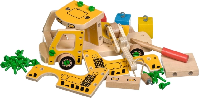El paquete incluye 16 piezas de madera para montar la grúa, tornillos, un destornillador y 4 bloques de colores que representan la carga. Este juguete también funciona como material Montessori, ayudando al niño a desarrollar eficazmente diversas habilidades.
