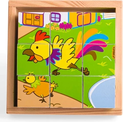 Nueve resistentes cubos de madera forman en conjunto seis adorables imágenes de animales. Los niños pueden girar, combinar y crear con los cubos, lo que favorece de forma natural la motricidad fina, la destreza y la concentración. El set incluye una base de madera para facilitar el montaje y el guardado seguro: ideal para casa y para llevar de viaje.