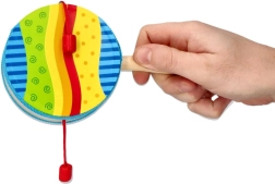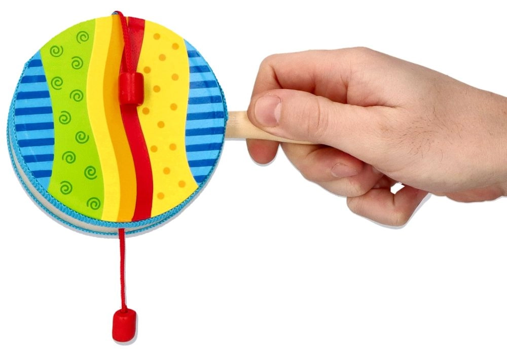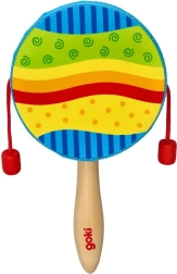 El tradicional “tambor de mendigo” en una versión moderna de la marca GOKI es un excelente instrumento de acompañamiento para niños. Gira el mango y las cuentas rojas en los cordeles resonarán rítmicamente contra la membrana del tambor. La velocidad de giro cambia de forma natural el tempo y el carácter del sonido, lo que potencia la percepción auditiva y el sentido del ritmo.