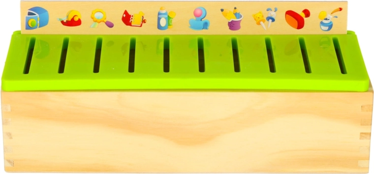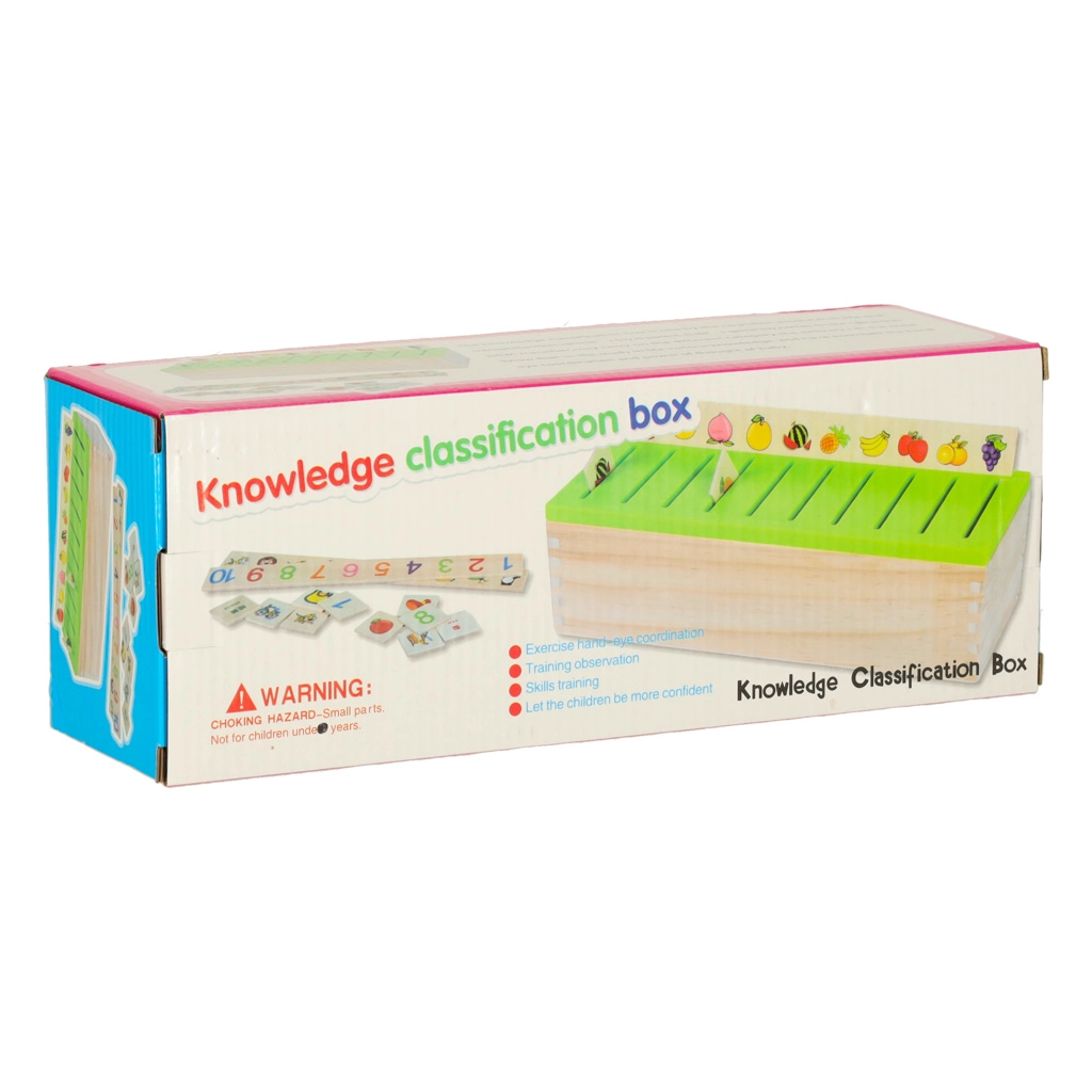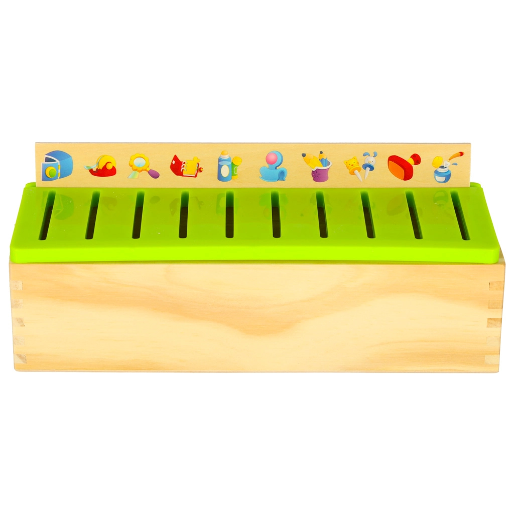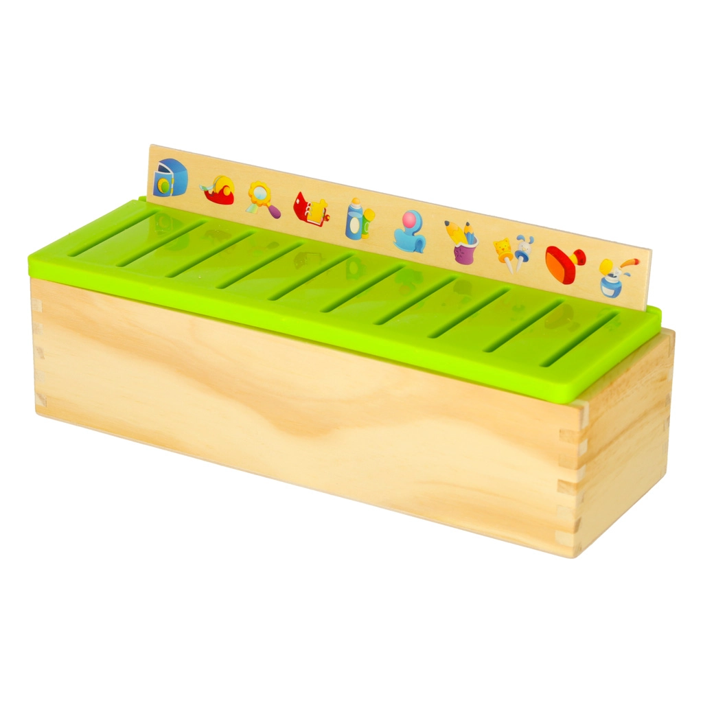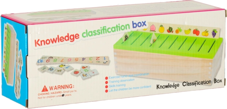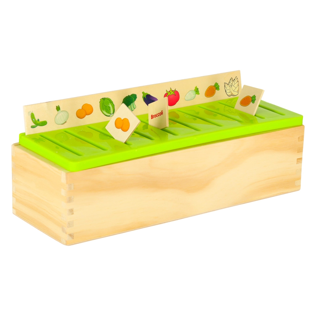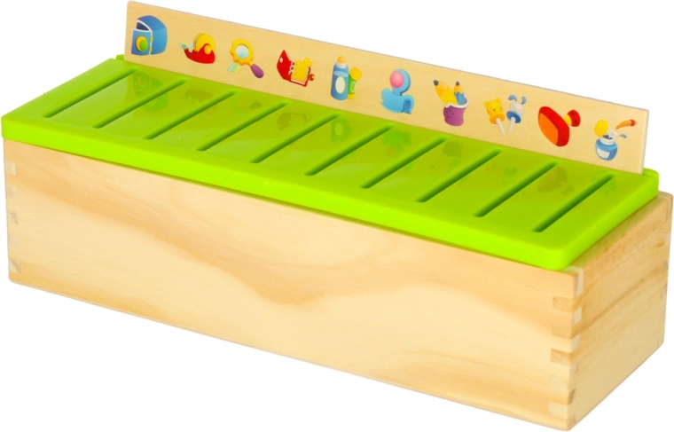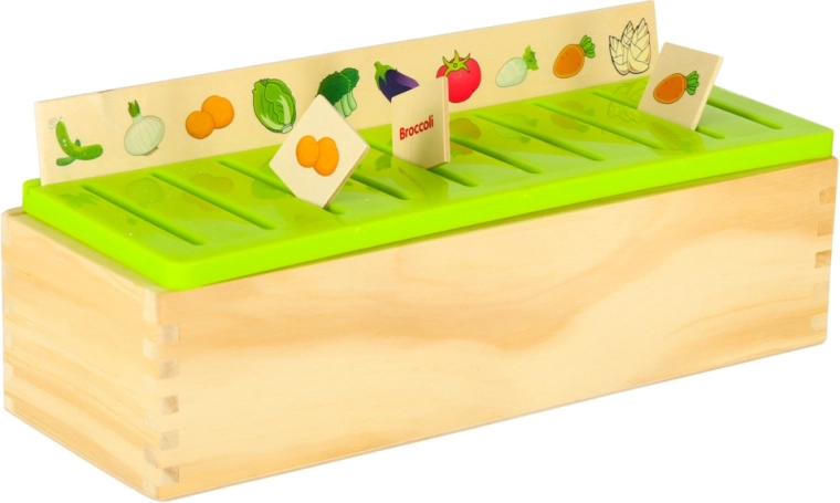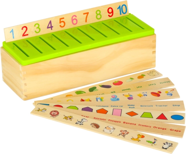 El clasificador educativo es un armario de madera bien pensado con tapa verde ventilada y un conjunto de grandes tableros temáticos (números, formas, animales, frutas y verduras, medios de transporte, etc.). Los niños emparejan pequeñas tarjetas de madera con ilustraciones en color y términos en inglés con las imágenes correspondientes del tablero y las deslizan en el slot correcto. Con ello entrenan la observación, la memoria, la concentración y construyen vocabulario.