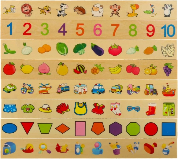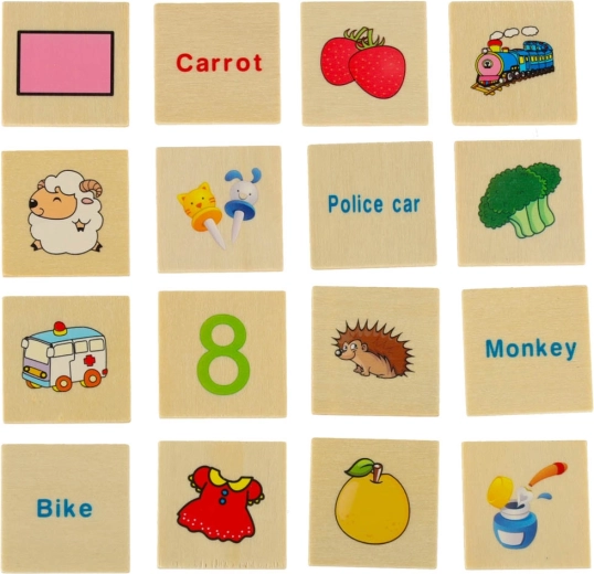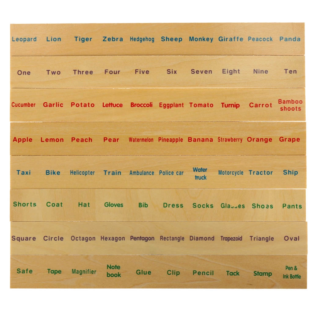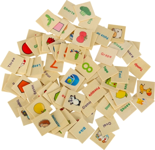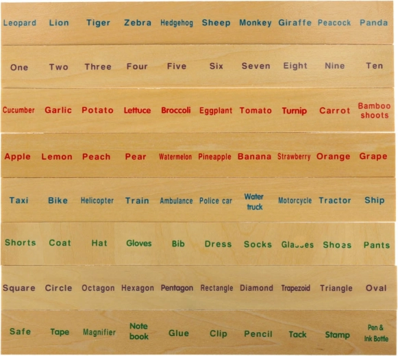 Los grandes tableros temáticos y 80 pequeñas tarjetas con ilustraciones y nombres en inglés enseñan a los niños a reconocer categorías, amplían el vocabulario y favorecen la memoria visual.