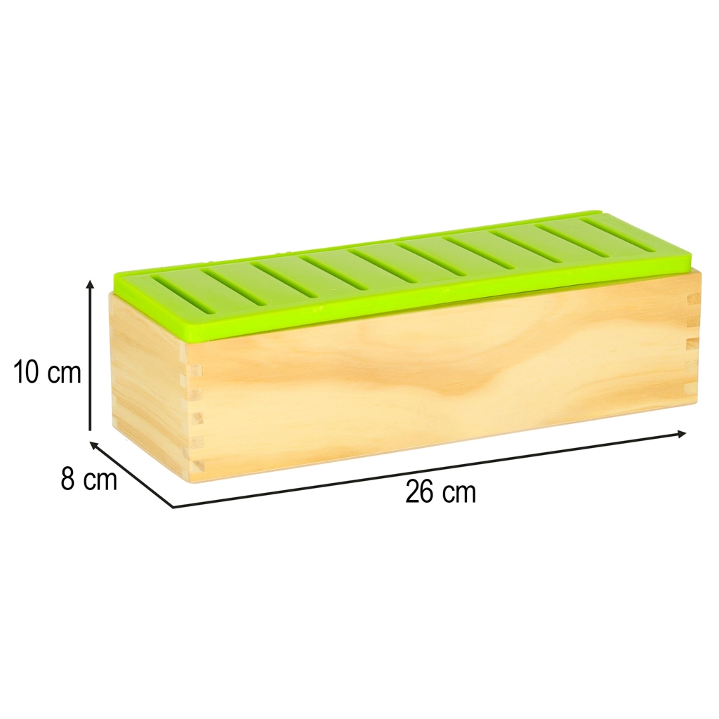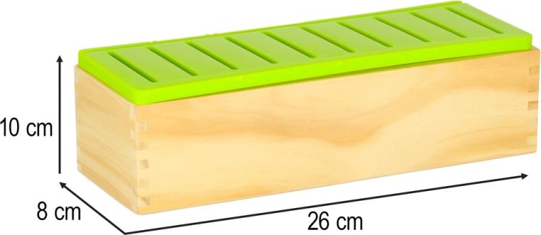 Madera sólida, bordes suavemente lijados y tapa de plástico extraíble con ranuras para insertar y limpiar fácilmente. Ideal para el juego diario.