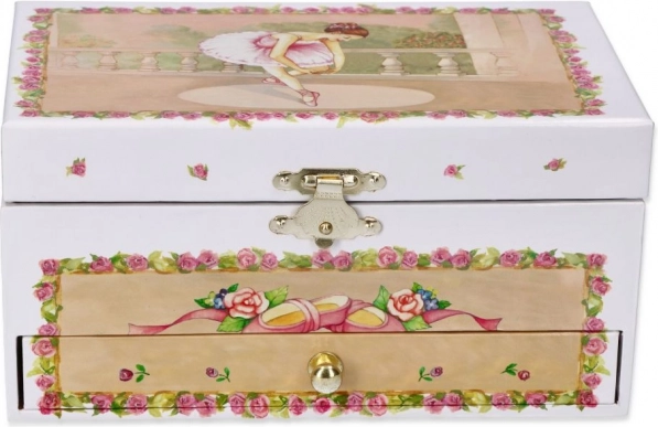 Elegante joyero musical con cajón y una adorable bailarina que encantará a cualquier pequeña coqueta. Al abrirlo, suena la melodía El lago de los cisnes y la bailarina gira frente al espejito. El joyero ofrece un práctico espacio de almacenamiento para accesorios y joyas y es un precioso complemento decorativo para la habitación infantil.