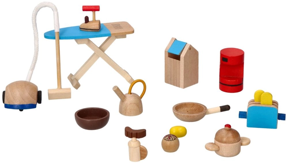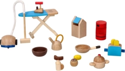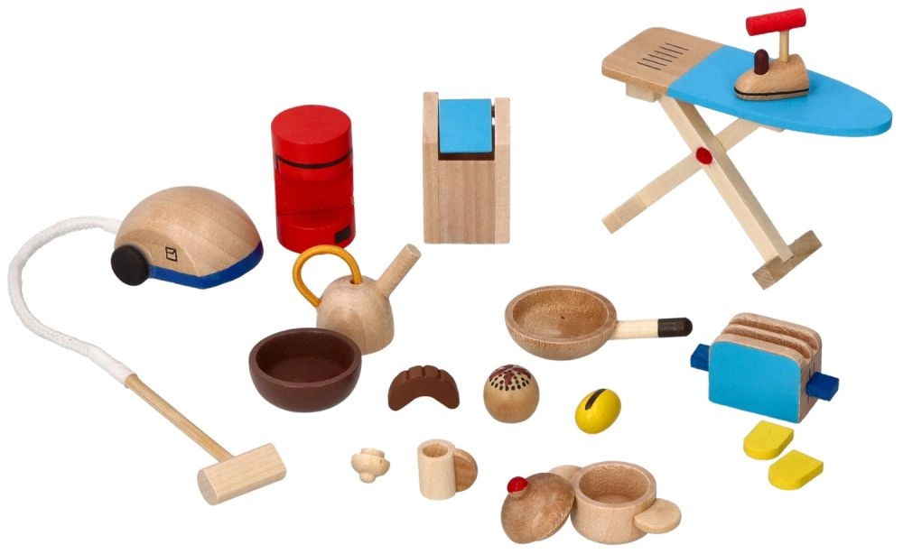 Con este precioso set de 19 juguetes de madera, los niños disfrutarán de horas de diversión en el entorno del hogar. El set incluye varios electrodomésticos domésticos que favorecen el desarrollo infantil y el conocimiento del mundo que nos rodea. En el paquete encontrarás juguetes como cafetera, jarrita, aspiradora, mesa de planchar y mucho más. Cada pieza está cuidadosamente elaborada con atención a la seguridad y a la estética.