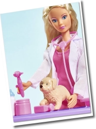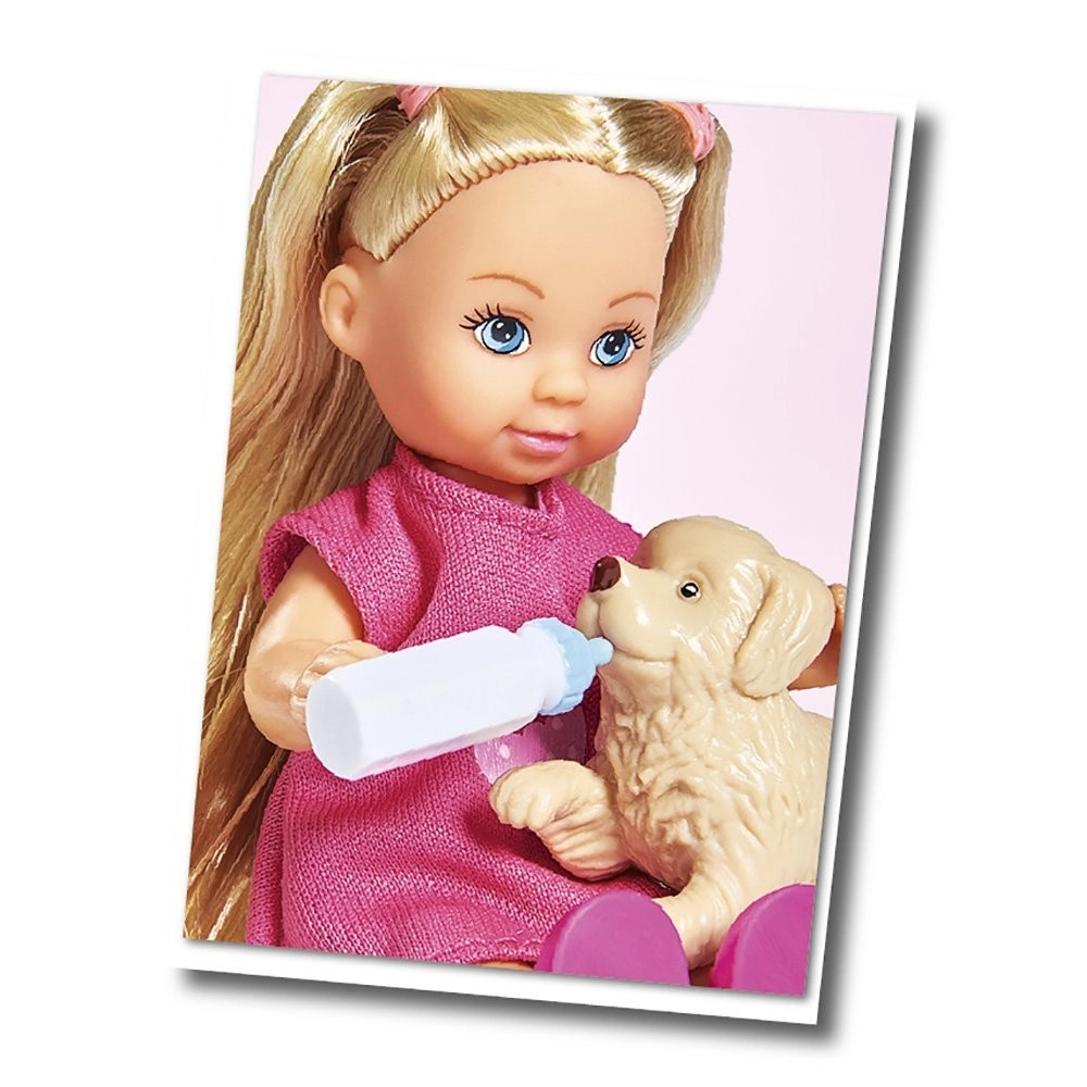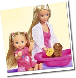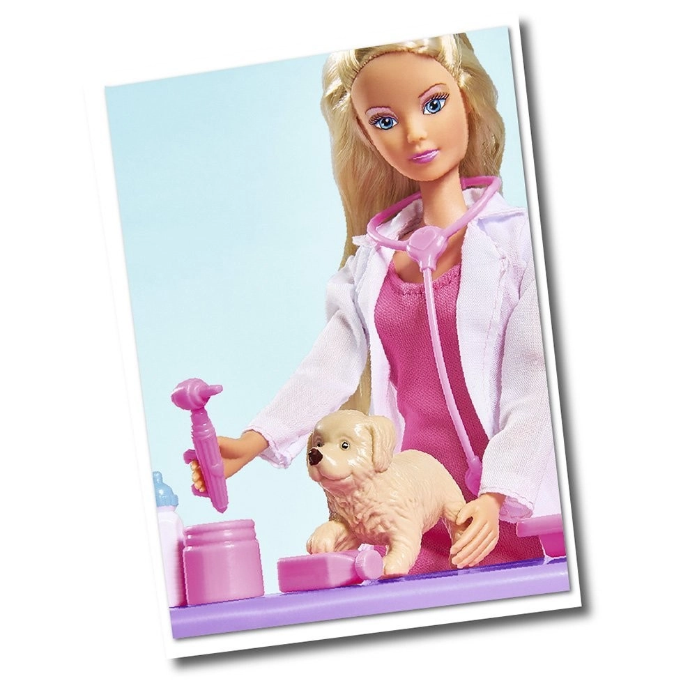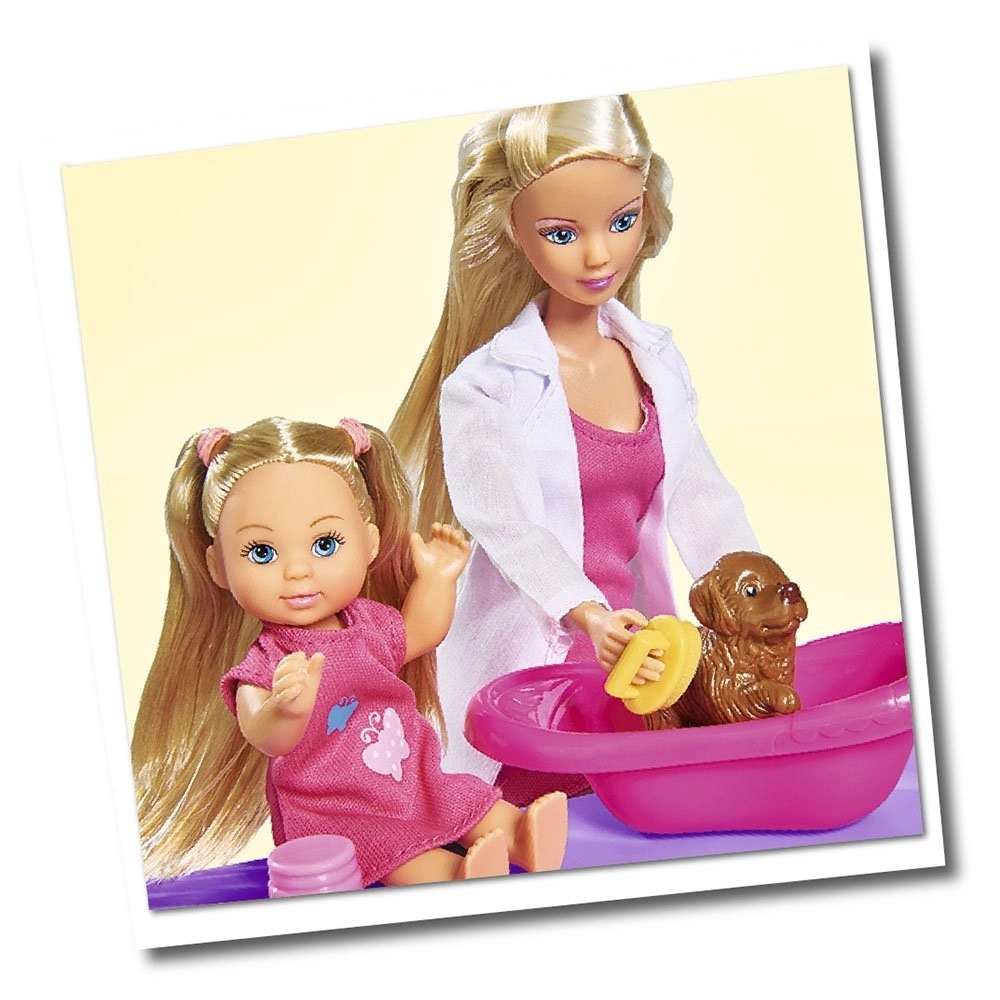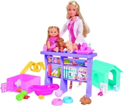 Con el set Steffi veterinaria, los niños pueden montar fácilmente una clínica para mascotas. La muñeca Steffi (29 cm) junto con la pequeña Evi (12 cm) cuidan de cuatro adorables animalitos y utilizan diversos accesorios que hacen el juego divertido y educativo.