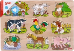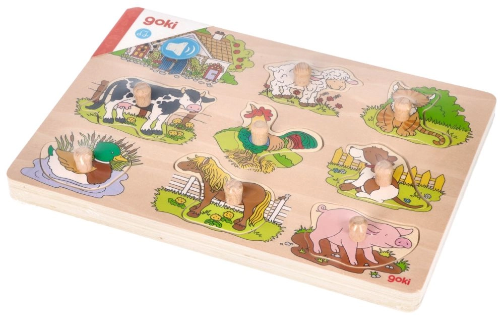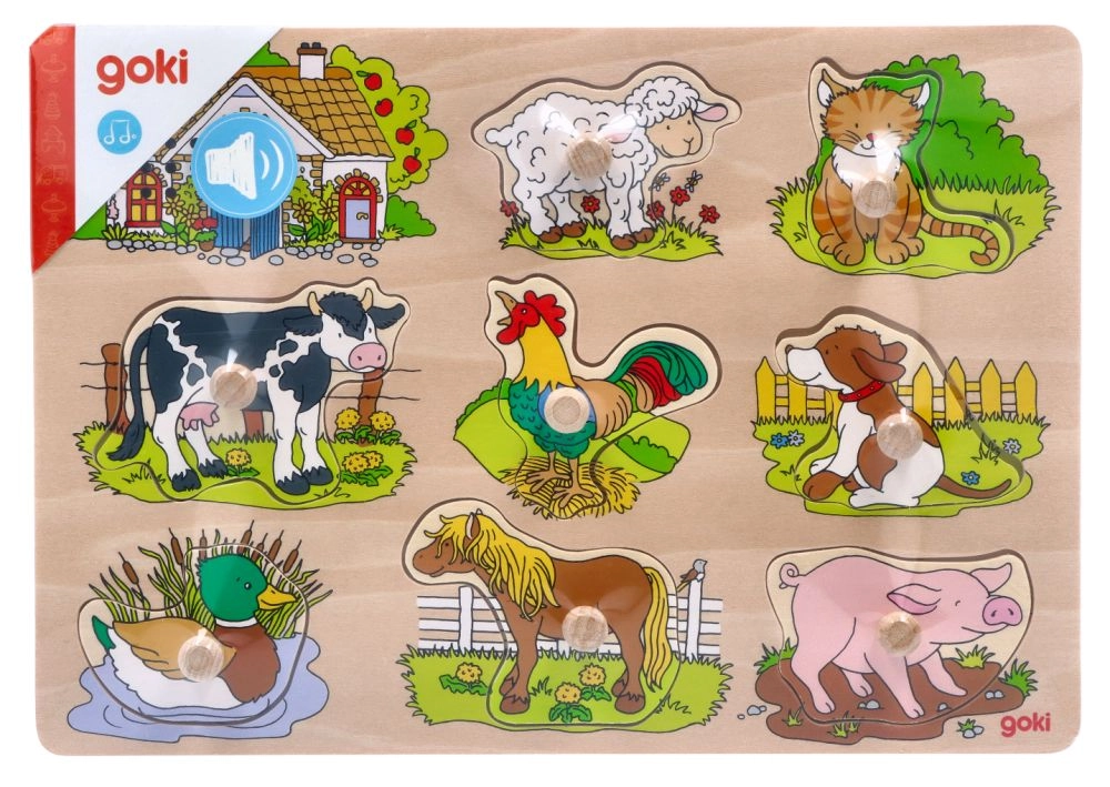 Este rompecabezas de madera incluye ocho piezas con imágenes de animales domésticos que, al colocarse en el hueco correcto, emiten un sonido característico. Cada pieza cuenta con un pomo de madera, lo que facilita su manipulación y un encaje seguro en la base. La base de madera con recortes precisos ayuda a los niños a colocar las piezas en los lugares correctos.