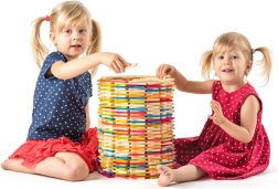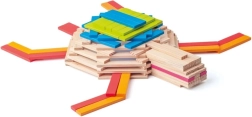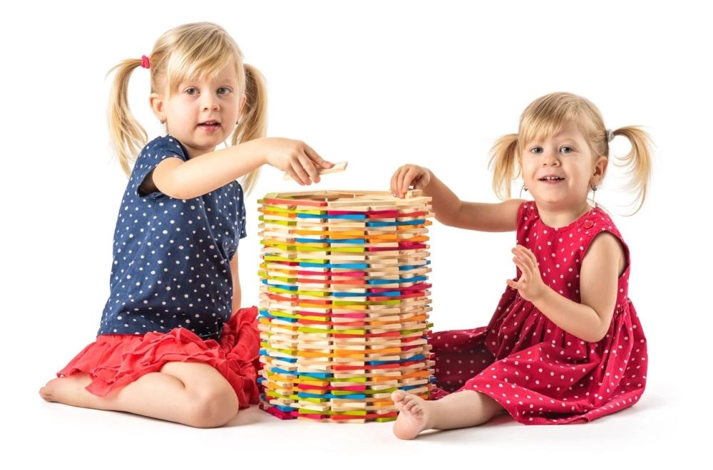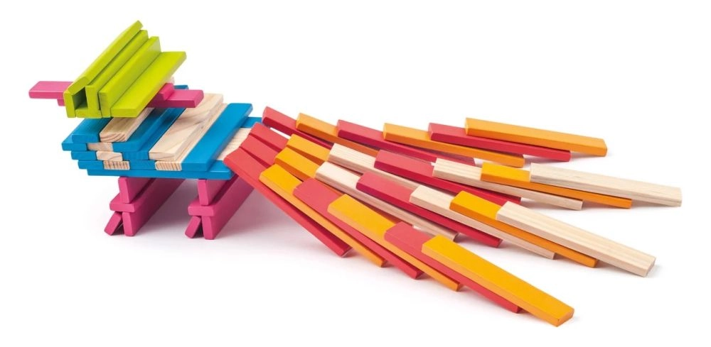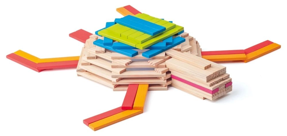 Las placas uniformes se apilan fácilmente para crear torres, puentes, animales y vehículos. Los niños ejercitan la imaginación y la planificación, mientras las construcciones se mantienen estables.