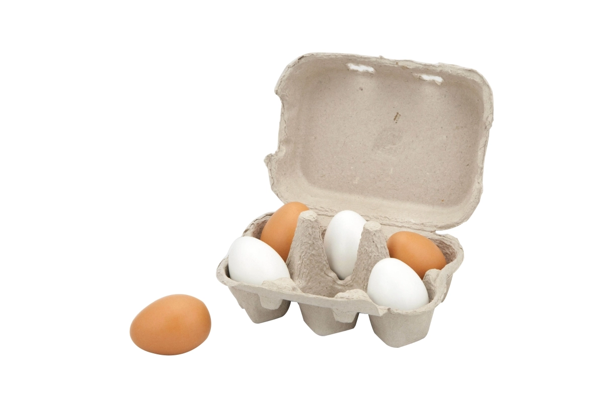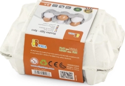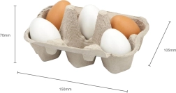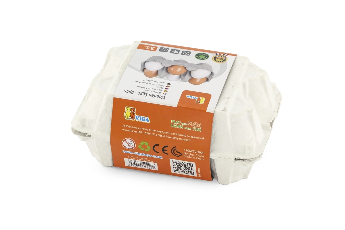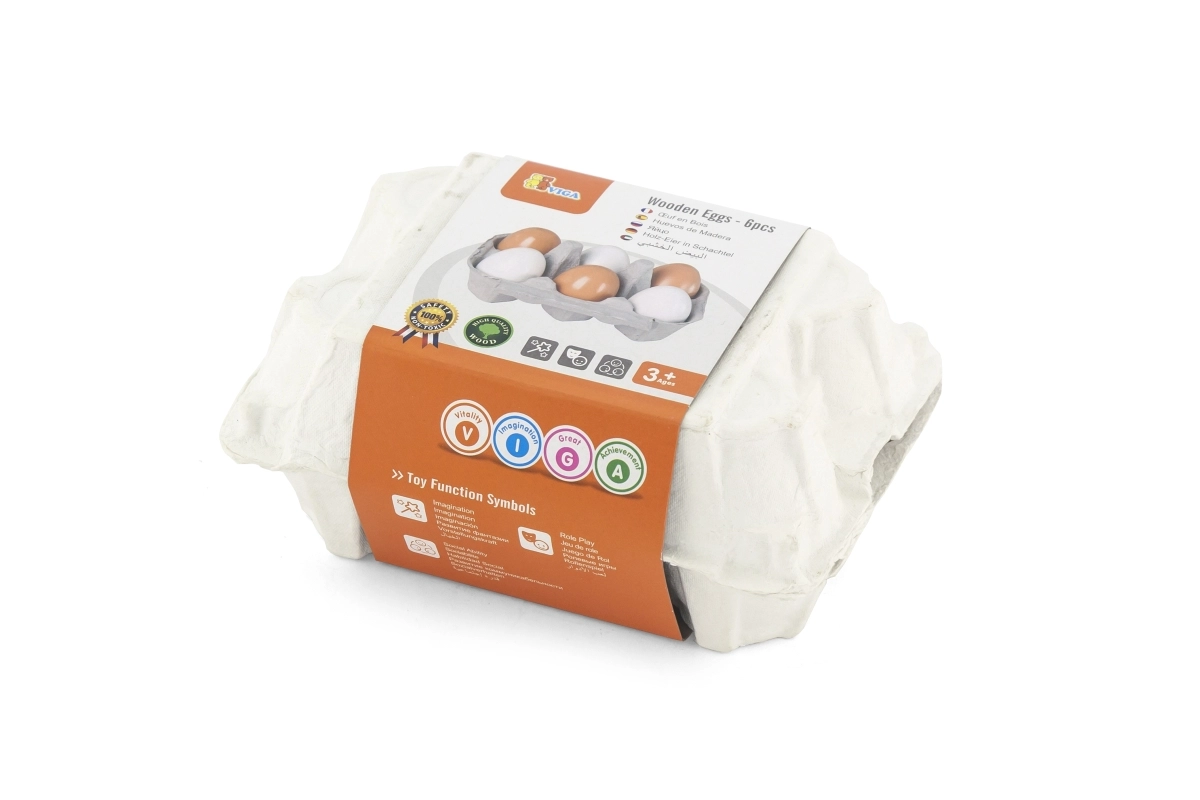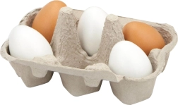 Seis huevos de madera en un cartón que parecen un paquete real. Ideal para la cocina infantil y el mercadito.