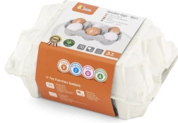 Los huevos están pintados con colores seguros y no tóxicos y tienen un tamaño realista (aprox. diámetro 4 cm, longitud 5,3 cm). Jugar con ellos desarrolla la imaginación, la creatividad y la inteligencia emocional: los niños prueban roles sociales y aprenden a colaborar.