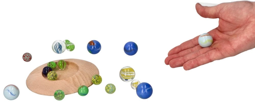 El set incluye 31 canicas de vidrio de distintos colores y tamaños para un juego variado.