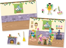 El set incluye coloridas ilustraciones de hadas y paisajes mágicos que invitan a los niños a crear sus propias escenas e historias.