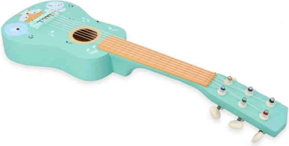 Bonita guitarra de madera para niños en color turquesa con ilustraciones de animalitos que motiva a los pequeños músicos a descubrir el mundo de la música. Ofrece fabricación de madera resistente, cuerdas reales y agarre fácil, por lo que es ideal para los primeros intentos musicales y el desarrollo del sentido rítmico y la creatividad.