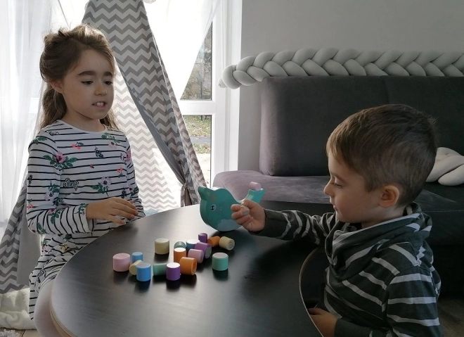Los niños apilan cilindros de madera sobre una base oscilante con forma de narval y entrenan la motricidad fina, la coordinación y la estimación. Cada jugada es un reto para mantener la estabilidad.