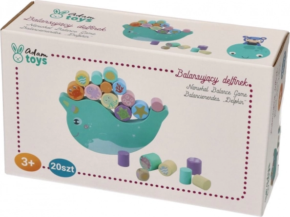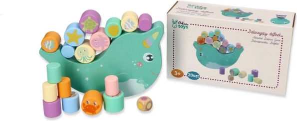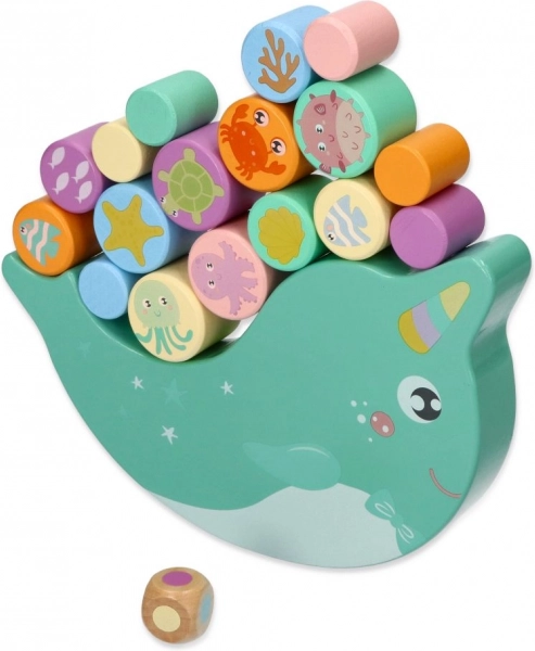 Descubre el divertido juego de equilibrio de madera con narval, en el que los niños equilibran coloridos cilindros con motivos de animales marinos sobre una base en forma de balancín. El objetivo es mantener la equilibrio y colocar las piezas de modo que el narval no se vuelque: un juego ideal para entrenar la motricidad fina, la coordinación ojo–mano y la paciencia.
