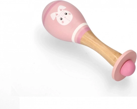 Adorable maraca de madera rosa para bebés con motivo de conejito, emite un tintineo suave que favorece la percepción auditiva y la motricidad fina. Gracias a su superficie lisa, bordes redondeados y tamaño para la mano del bebé, es ideal para niños a partir de 5 meses. Certificación CE y materiales seguros para jugar con tranquilidad cada día.
