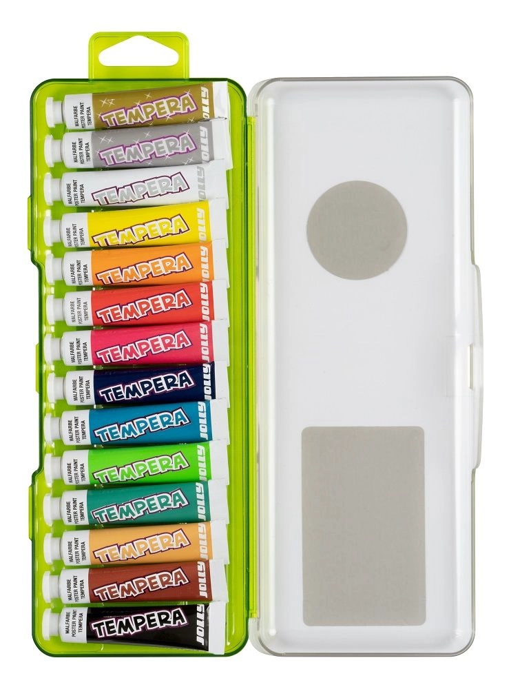 El set de témperas Jolly ofrece una paleta variada para artistas pequeños y grandes. El paquete incluye 12 colores básicos, además de los únicos tonos plata y oro, que aportan un brillo especial a tus proyectos. Estos colores vivos destacan por su excelente poder de cobertura y su fácil aplicación.