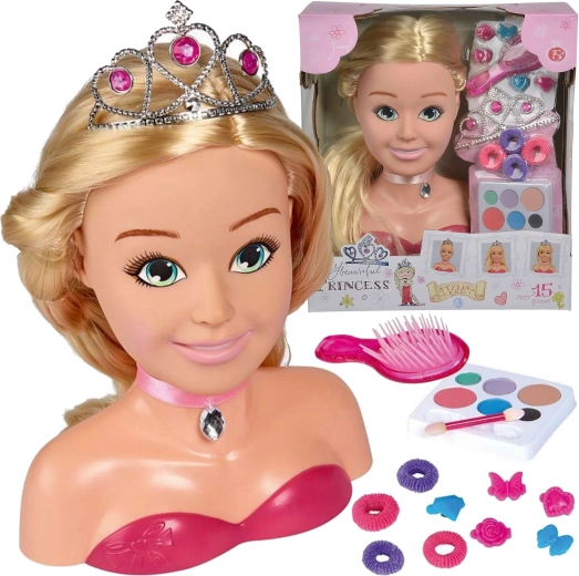 - Cabeza de estilismo PRINCESS, corona, cepillo, 5 horquillas, gomas, paleta de maquillaje con aplicador