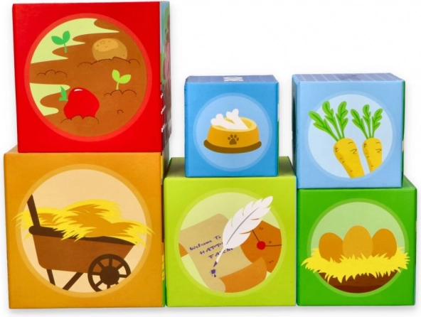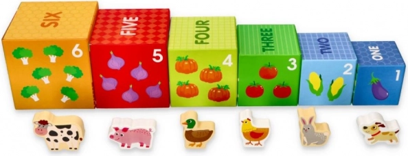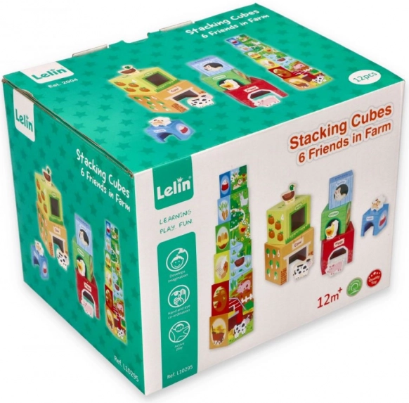 Este colorido set de cubos apilables con temática de granja ofrece a los niños infinitas posibilidades de juego: desde construir una torre alta hasta encajar y clasificar, pasando por descubrir números, frutos y adorables animalitos. Cada cubo está ilustrado para favorecer la percepción visual, el reconocimiento de formas y cantidades y los primeros conteos.