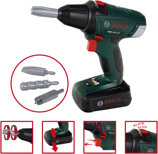 La gran protagonista es el taladro/atornillador inalámbrico con sonido, efecto de luz y tornillo giratorio, que simula a la perfección el funcionamiento de una herramienta real. No faltan 4 accesorios intercambiables, una sierra con empuñadura cómoda, un martillo, una llave inglesa, 2 placas de plástico perforadas, 4 tornillos y 2 clavos, todo fabricado en plástico resistente.