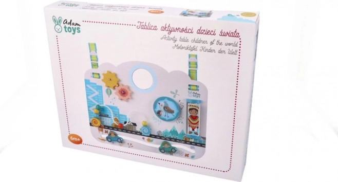 El tablero de madera «Niños del mundo» está diseñado para fomentar de forma natural el desarrollo sensorial y la exploración autónoma. El escenario urbano en tonos pastel con animalitos, cochecitos y personajes invita a investigar y estimula la imaginación. El niño elige su propio ritmo y forma de juego, reforzando así la autoconfianza y la paciencia.