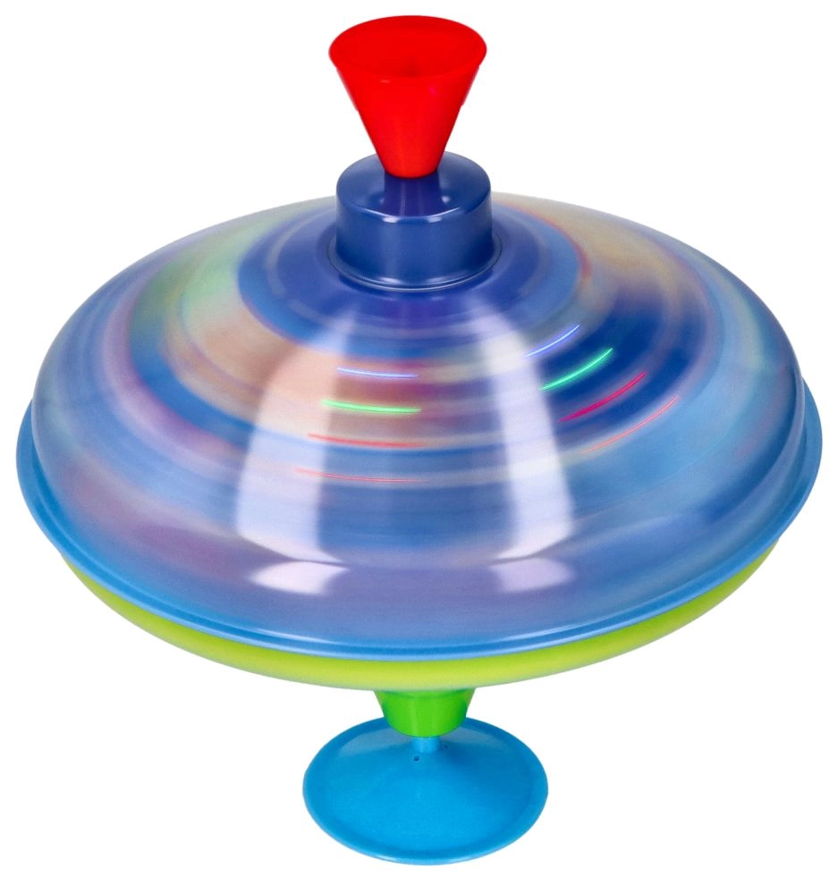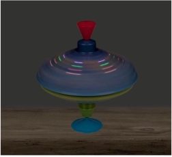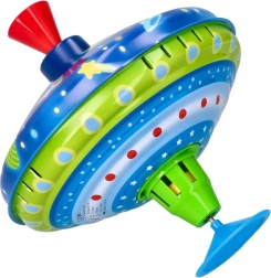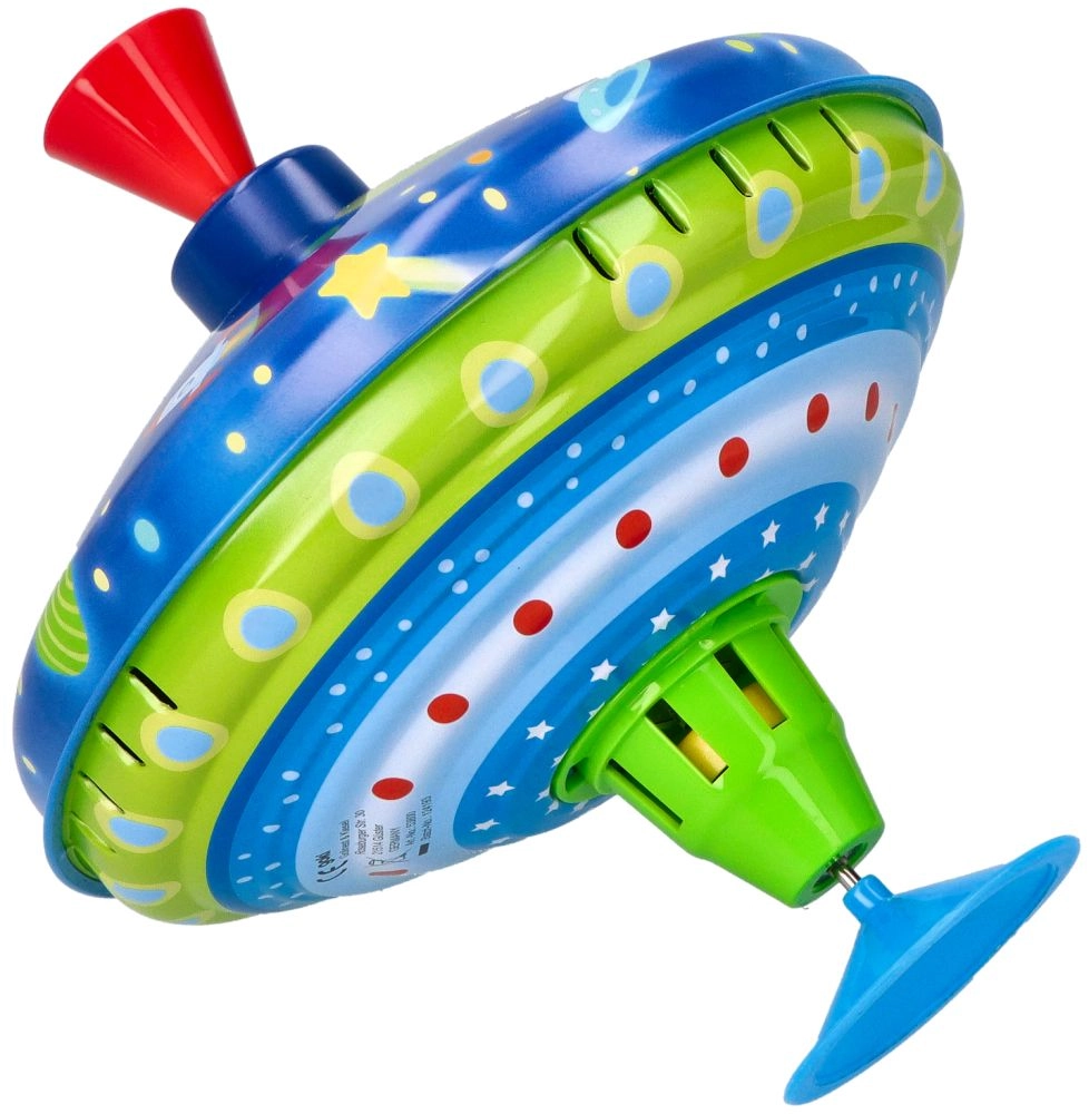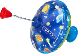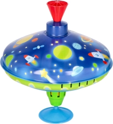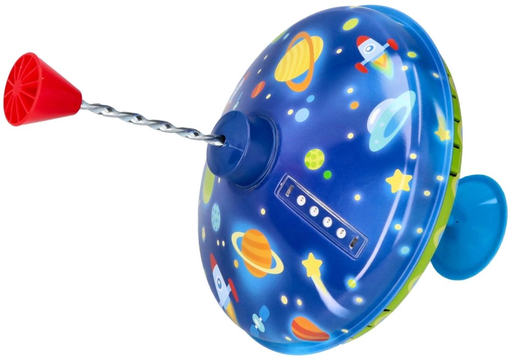 Esta colorida peonza metálica con motivos espaciales llama la atención a primera vista. Gracias a la base integrada se mantiene firme en su sitio, por lo que es adecuada incluso para los más pequeños. Con solo presionar el mango superior, la peonza gira, se encienden las luces LED y emite un sonido característico pero agradable que realza la alegría del juego.