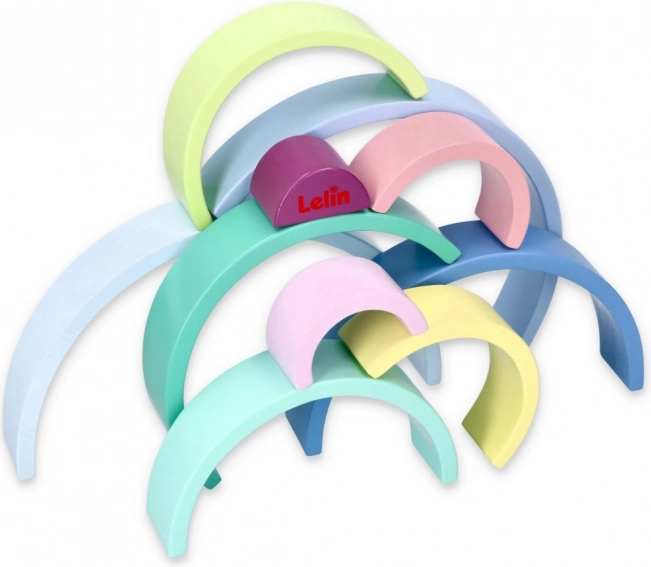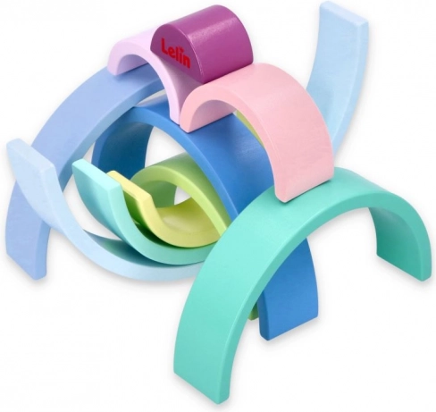 Los arcos de madera en colores pastel como azul, verde y rosa fomentan el reconocimiento de colores y el juego creativo.