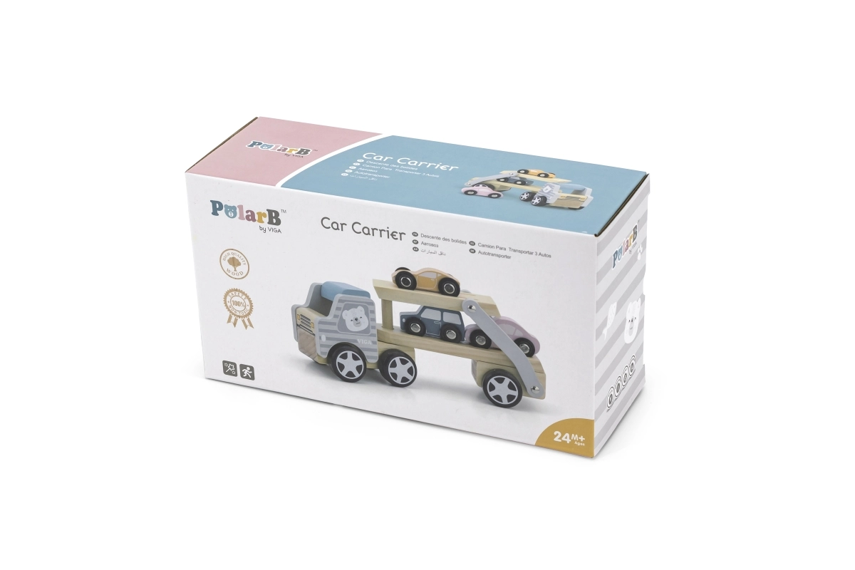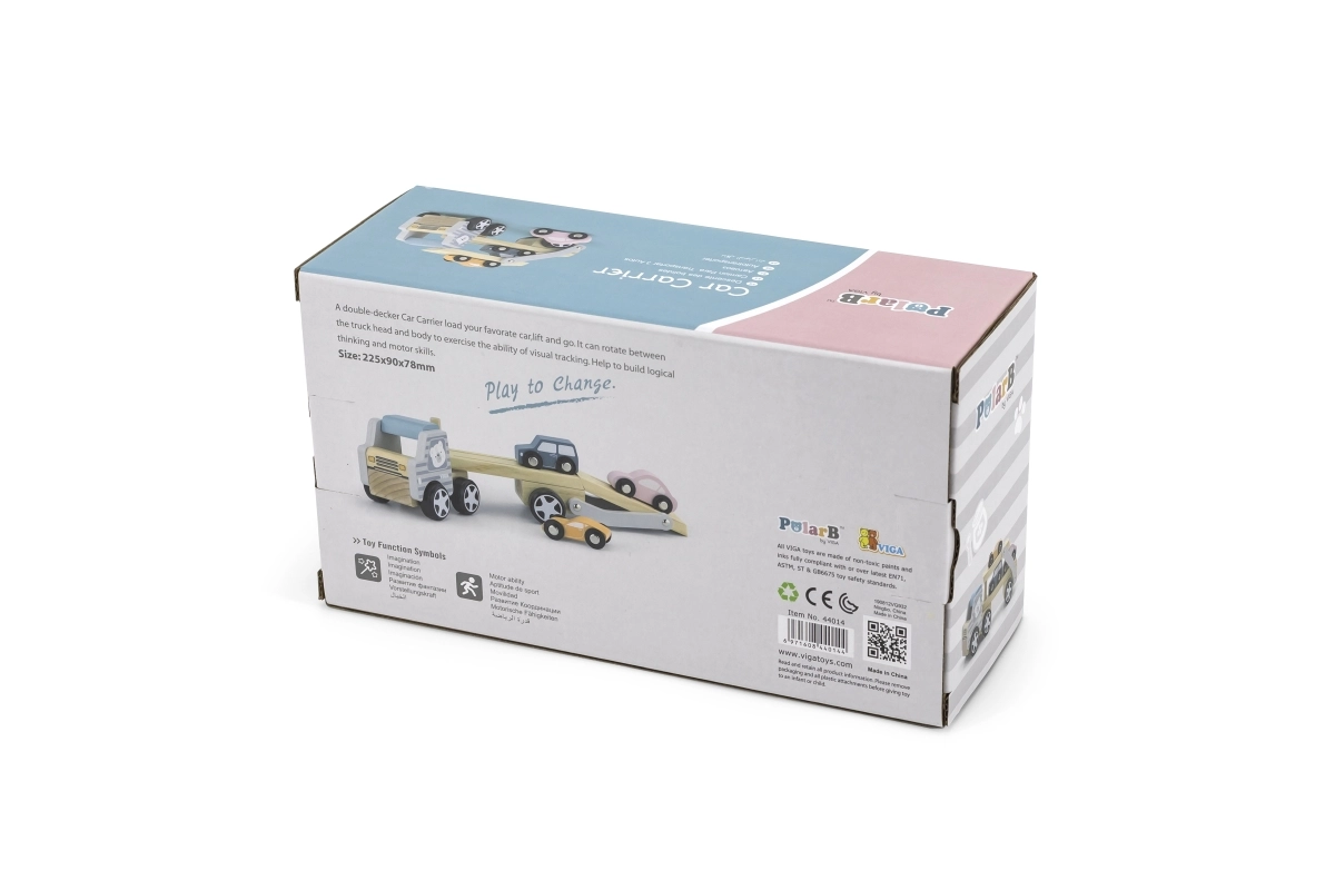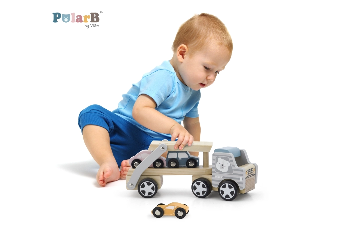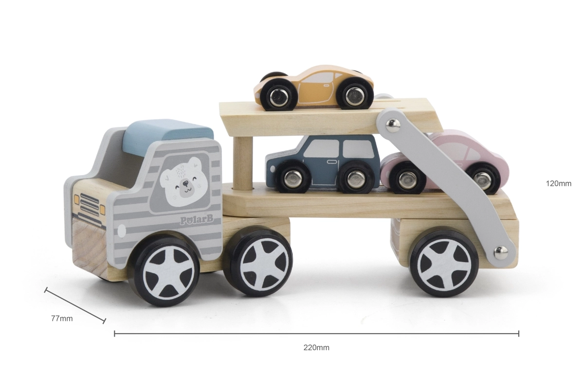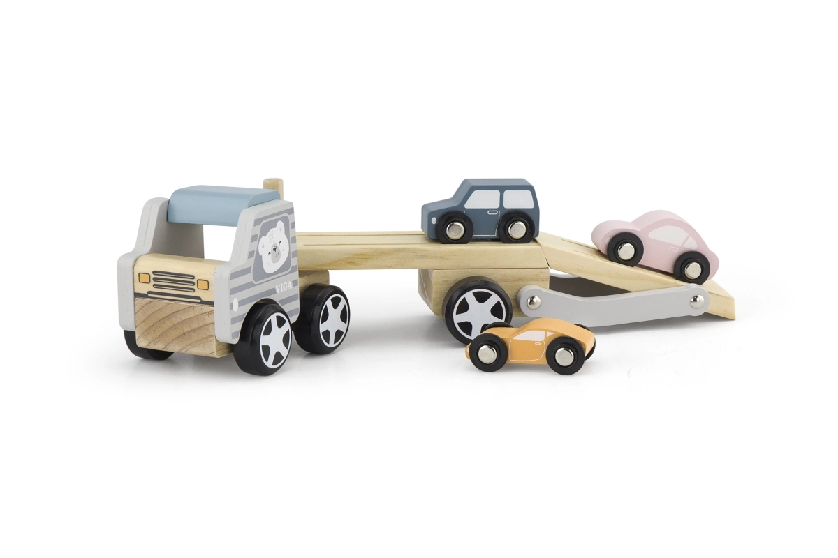 La grúa de madera VIGA PolarB ofrece diversión y aprendizaje en uno. El set incluye un camión con remolque y tres cochecitos de colores que se pueden cargar fácilmente mediante la rampa abatible. La madera resistente y el esmerado acabado garantizan una larga vida útil, mientras que las pinturas no tóxicas que cumplen las normas EN71 y ASTM aseguran la seguridad en el juego diario.