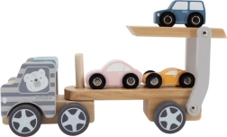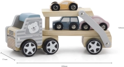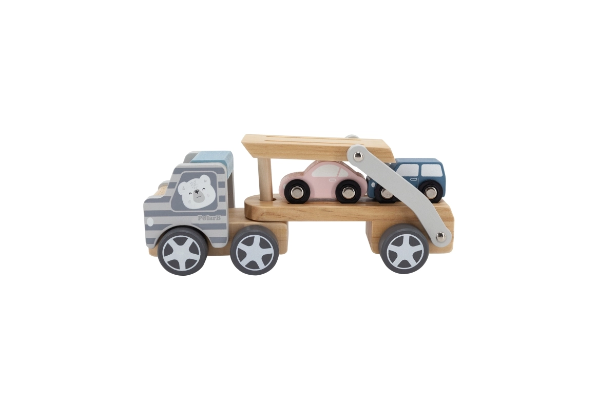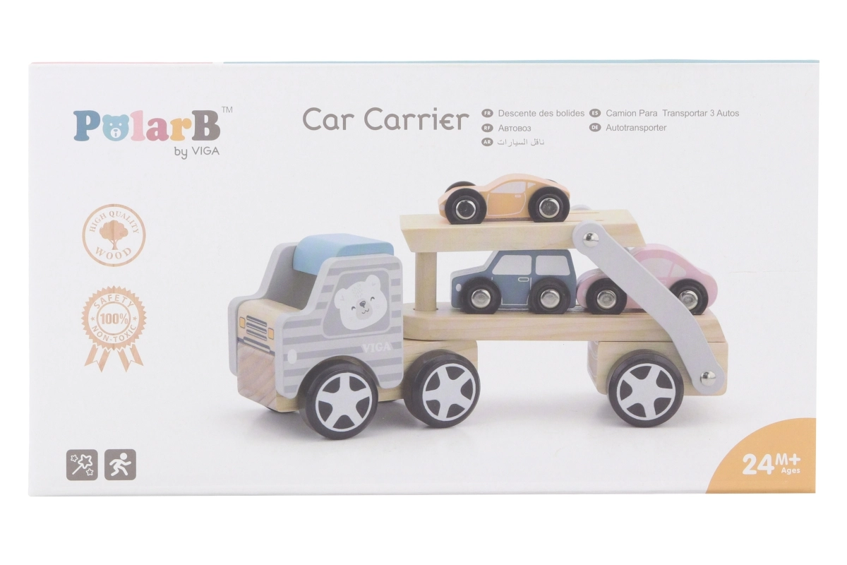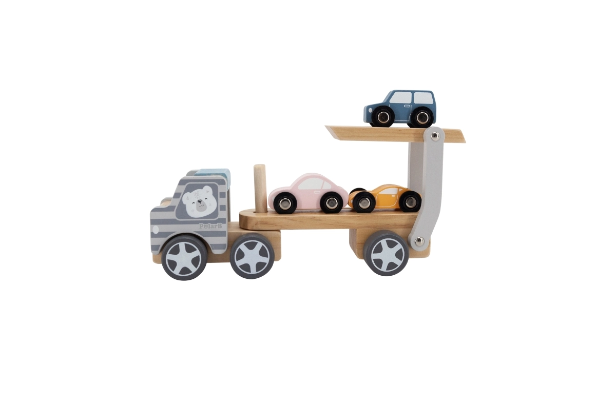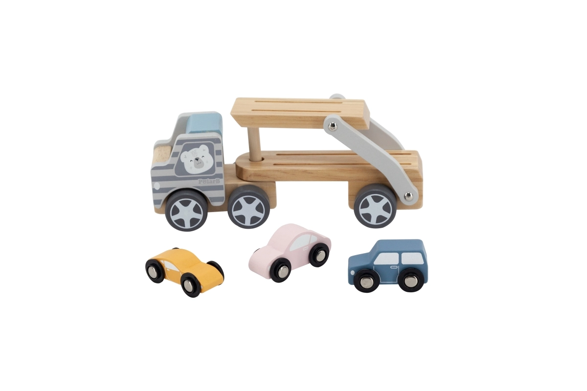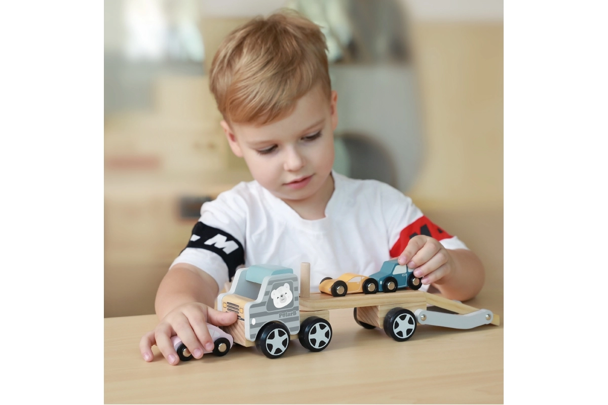La grúa de madera VIGA PolarB ofrece diversión y aprendizaje en uno. El set incluye un camión con remolque y tres cochecitos de colores que se pueden cargar fácilmente mediante la rampa abatible. La madera resistente y el esmerado acabado garantizan una larga vida útil, mientras que las pinturas no tóxicas que cumplen las normas EN71 y ASTM aseguran la seguridad en el juego diario.