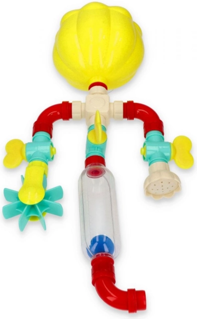 Vierte agua en el embudo amarillo y observa cómo hace girar las ruedas y crea salpicaduras: el baño se transforma en una aventura al instante.