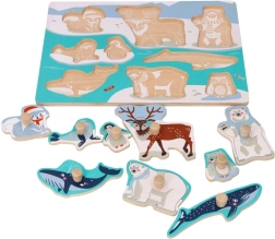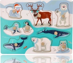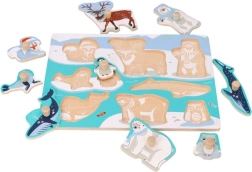 Este rompecabezas de calidad está fabricado completamente en madera y ofrece a los niños un juego seguro y estimulante. Cada pieza representa un animal del Ártico y está equipada con un práctico pomo para levantarla y colocarla fácilmente en el hueco correcto.