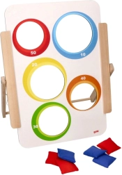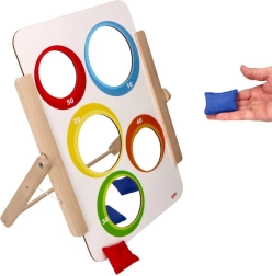 Lanzar los saquitos de tela a los orificios potencia la precisión, la concentración y la coordinación ojo–mano de forma lúdica.