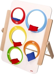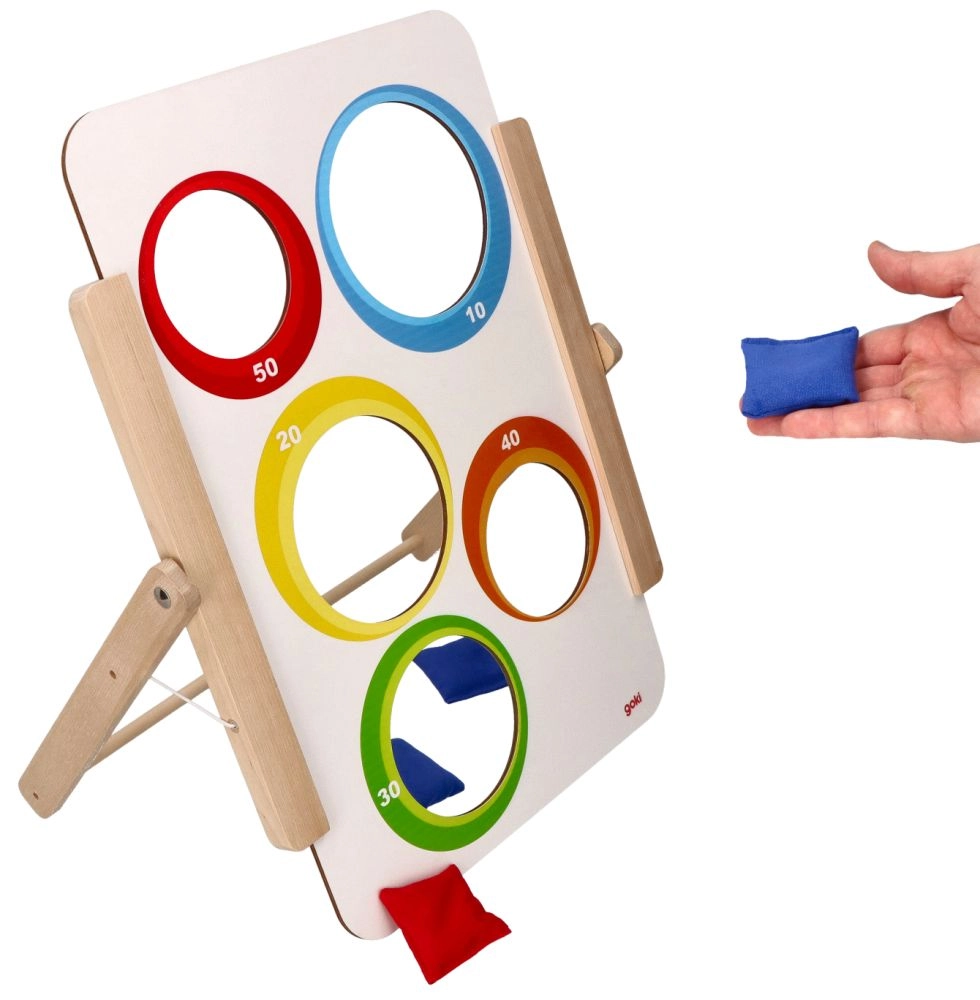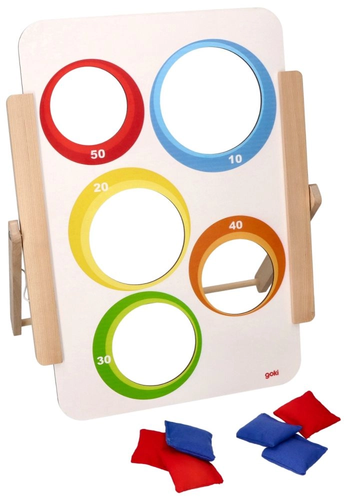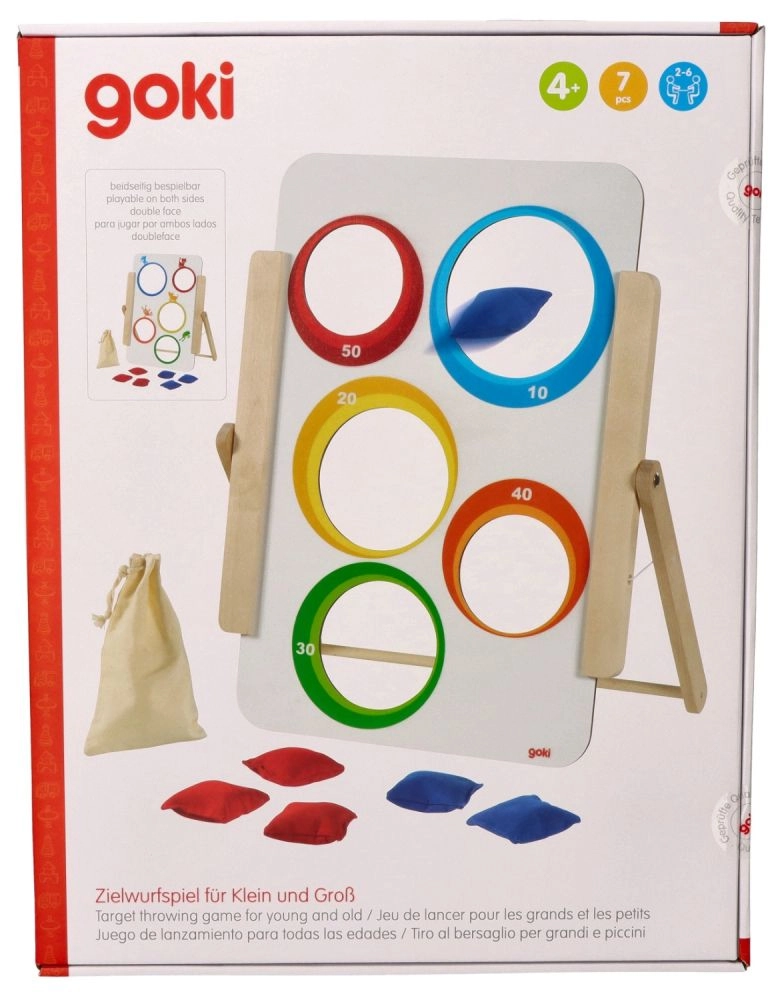El juego de lanzamiento a diana de Goki ofrece una diversión sencilla pero adictiva para pequeños y mayores. La tabla de madera con cinco orificios está ilustrada con animales por un lado y por el otro muestra valores de puntuación numerados (10–50). Los niños entrenan precisión, concentración y motricidad fina mientras compiten por la máxima puntuación.