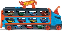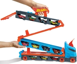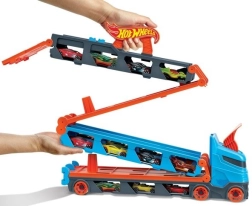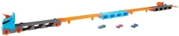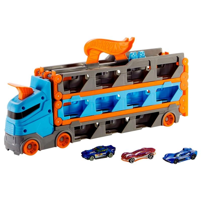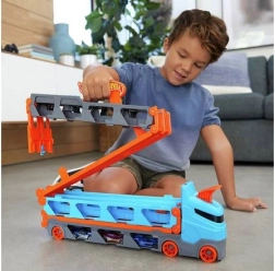 Convierte el camión en cuestión de segundos en una pista de carreras completa. El transportador alberga hasta 20 cochecitos tras ventanillas transparentes, para tener tu colección siempre a la vista. Tirando del asa, el remolque se despliega en una pista de dos carriles de 1,8 m, mientras la cabina se transforma en una estación de lanzamiento doble para salidas equitativas.