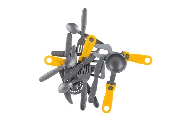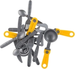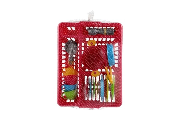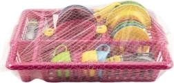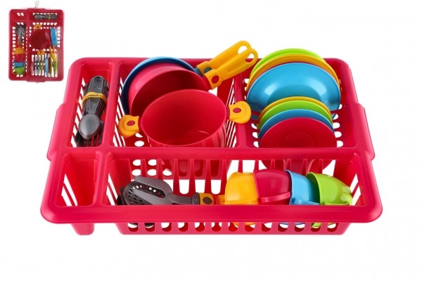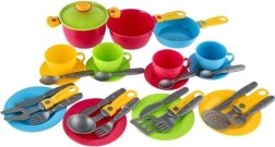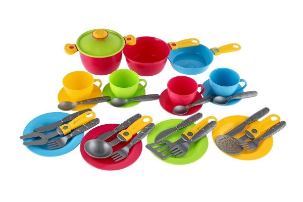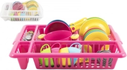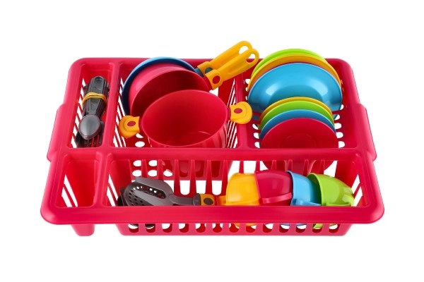 Alegre juego de cocina infantil en un práctico escurreplatos que ofrece horas de diversión creativa. Incluye todo lo que necesitan los pequeños chefs: platos, tazas con platillos, cubiertos, olla con tapa y sartenes. Sus colores intensos atraen la atención y desarrollan la imaginación, la motricidad fina y los hábitos de orden: después de “cocinar”, la vajilla se coloca fácilmente en el escurreplatos, como hace mamá.