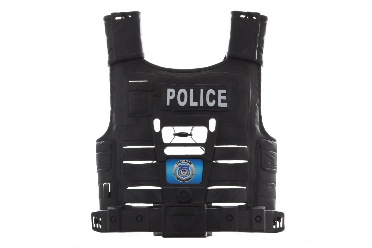 Equipamiento policial realista para disfraces infantiles y aventuras cotidianas. El chaleco negro con la inscripción POLICE ofrece un aspecto auténtico y bolsillos prácticos, la metralleta con efecto de traqueteo potencia la experiencia de acción y el casco con diseño de camuflaje completa el atuendo.