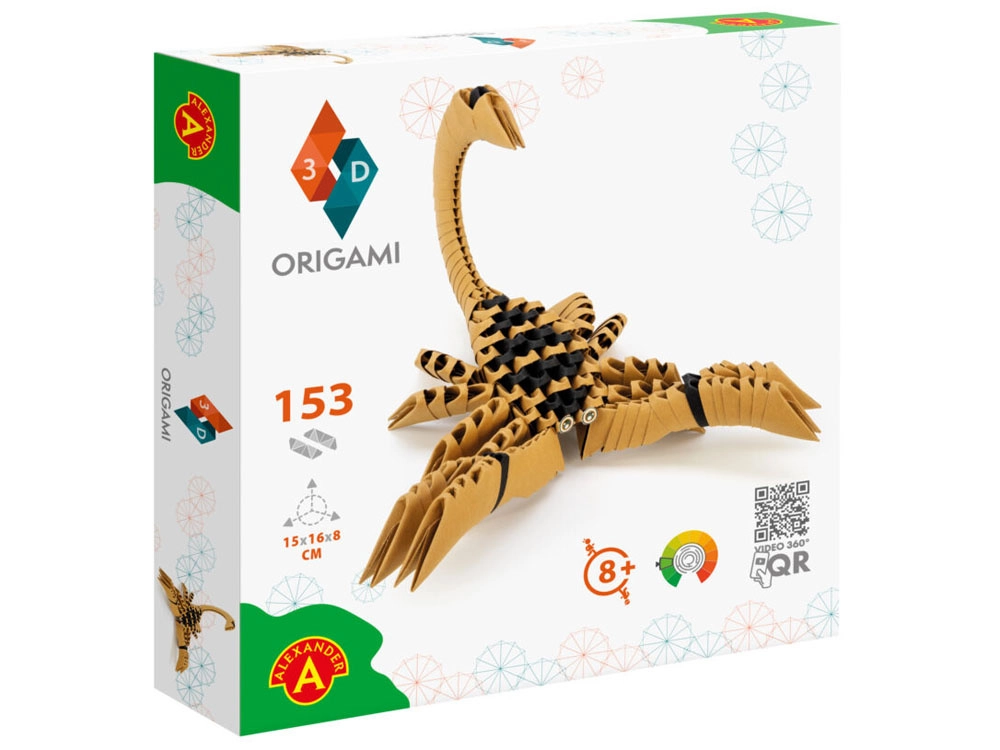 El origami 3D Escorpión de la marca Alexander es una actividad creativa divertida y relajante para niños y adultos. Las piezas tienen una forma patentada con línea de plegado marcada, por lo que el módulo básico se arma con tres movimientos simples y luego se encajan sin pegamento. El modelo terminado tiene un aspecto decorativo y se convertirá en un adorno original para la habitación.