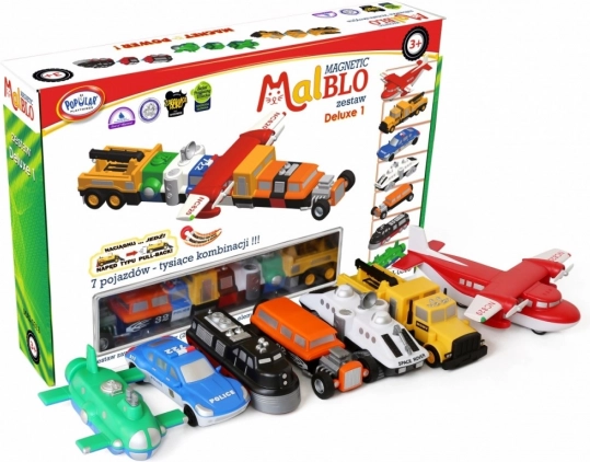 El set MalBlo MAGNETIC Deluxe es un juguete inteligente para pequeños constructores. 21 piezas en el paquete (7 vehículos listos) permiten ensamblar más de 1000 combinaciones diferentes, desde coches y remolcadores hasta aviones o máquinas del futuro. Las piezas tienen la fuerza magnética y mecánica ideal, por lo que se manipulan fácilmente y a la vez permanecen unidas con firmeza.