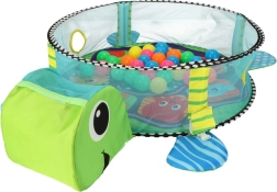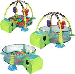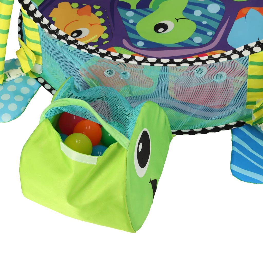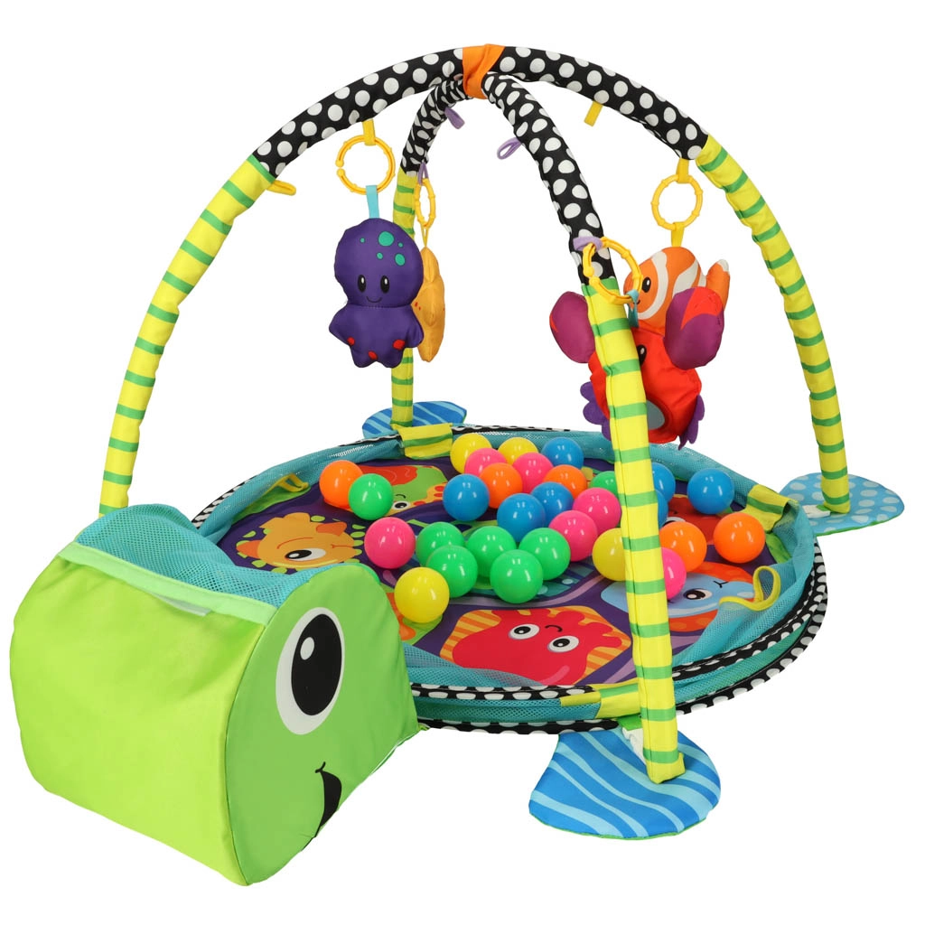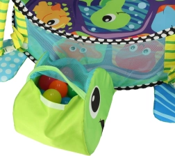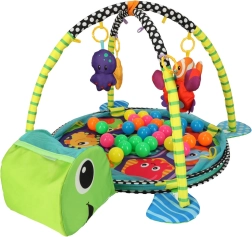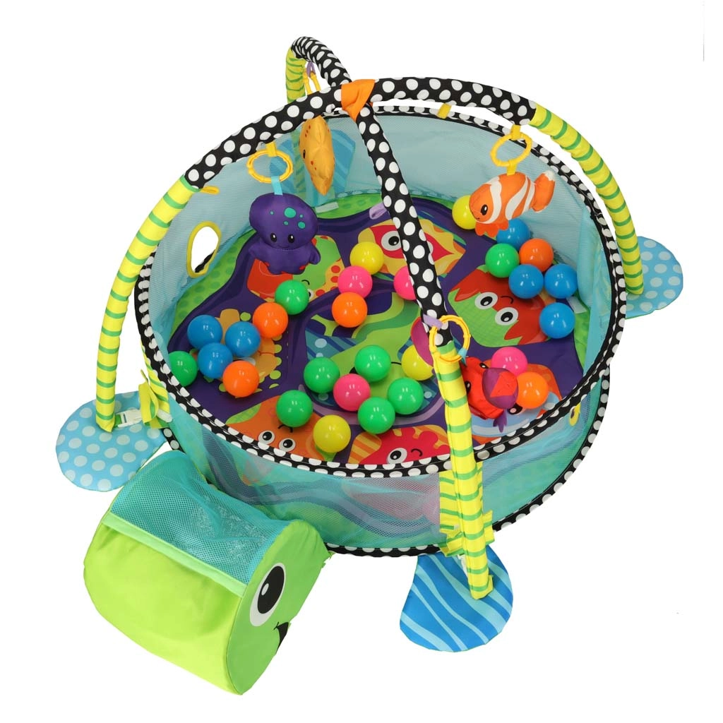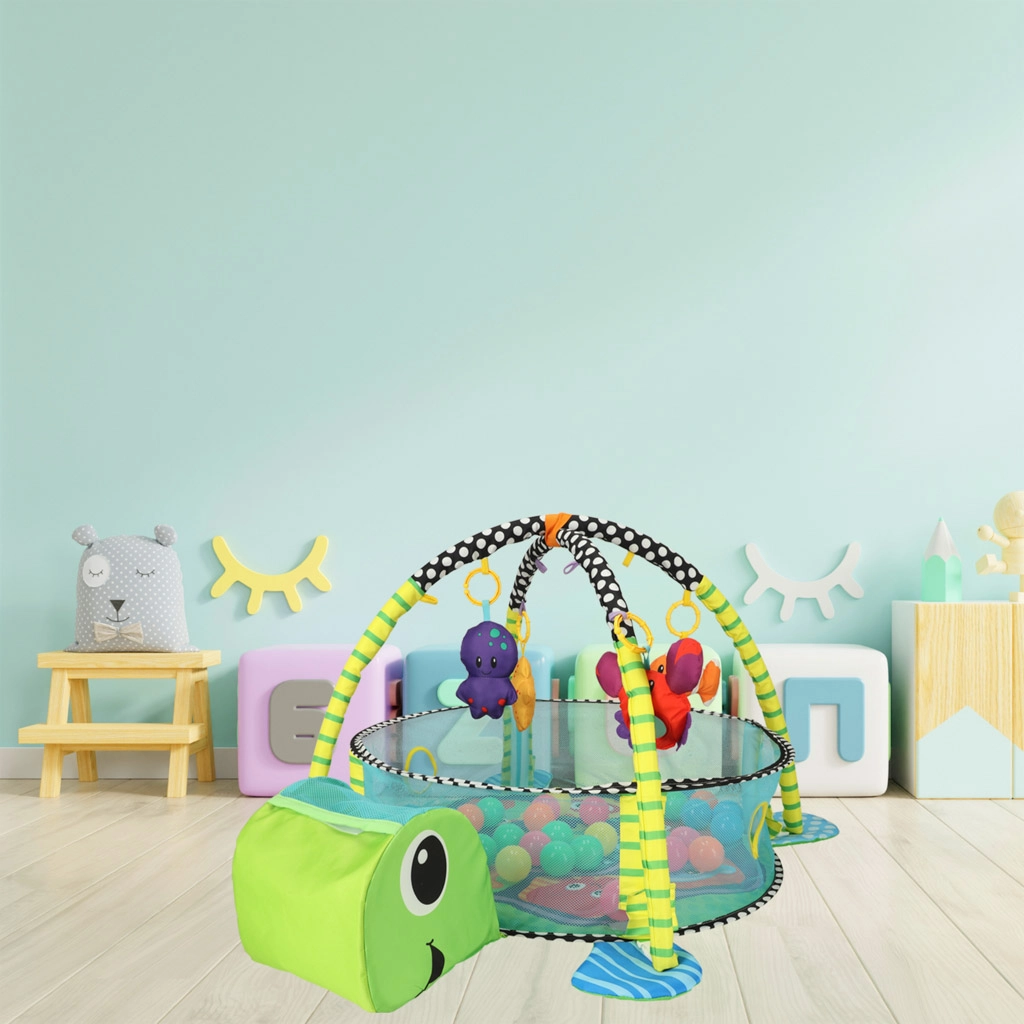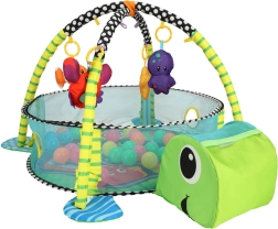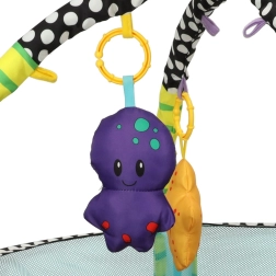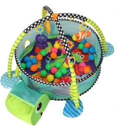 Incluye juguetes blandos con forma de pez, pulpo, estrella de mar y cangrejo con espejito, que desarrollan la visión, el tacto y la atención. Su estructura ligera se pliega rápidamente, por lo que es ideal para viajes y espacios pequeños.