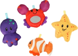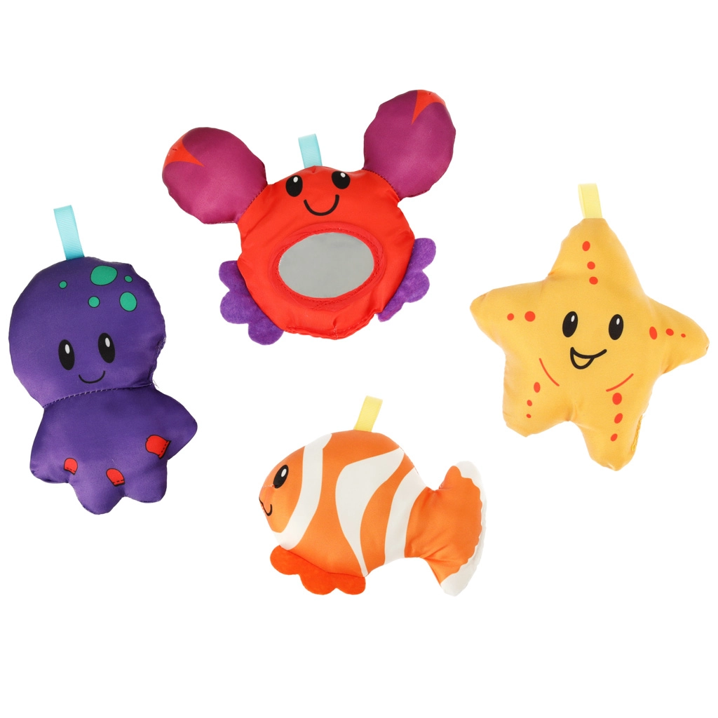 Pez, pulpo, estrella de mar y cangrejo con espejito estimulan la vista, el tacto y la coordinación mano-ojo, invitando al bebé a explorar y agarrar.