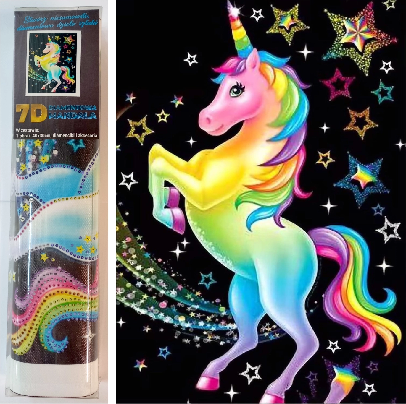 Descubre el mundo relajante de la creación con el set de pintura de diamantes Unicornio arcoíris en formato 30 × 40 cm. En el paquete encontrarás todo lo necesario: lienzo impreso, bolígrafo aplicador, cera, bandeja y piedras de colores. La sencilla técnica de pegar las piedras en los lugares indicados ofrece relajación, diversión creativa para todos y un regalo ideal para cualquier ocasión.