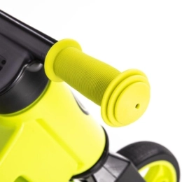 Los neumáticos blandos garantizan un funcionamiento silencioso sin marcas en el suelo, no sufren pinchazos y no requieren inflado. El bloqueo del manillar evita el giro excesivo y protege el abdomen del niño, mientras que los puños superblandos con extremos ensanchados protegen sus manos. El ajuste de altura de los ejes en 2 posiciones adapta la bici a niños más pequeños y más grandes.