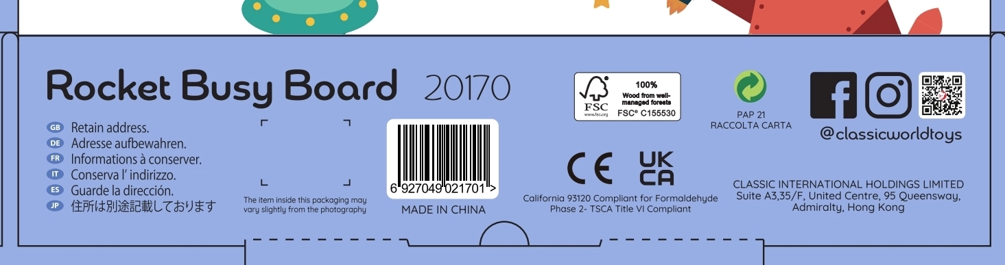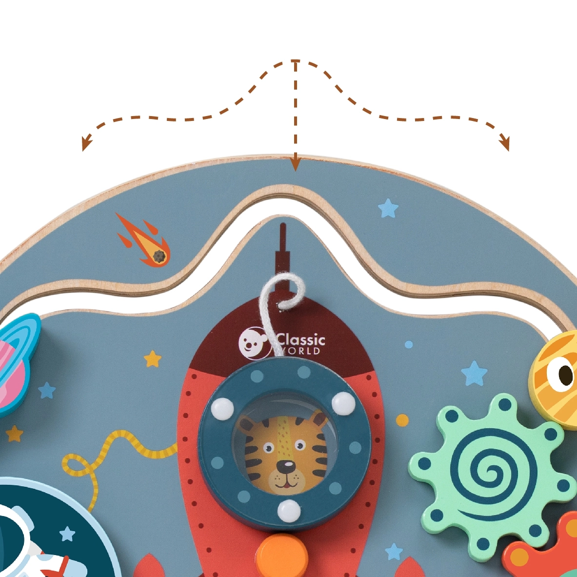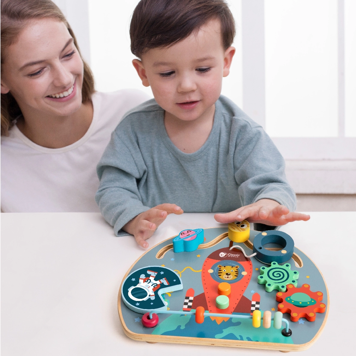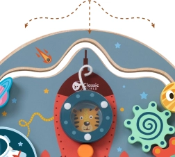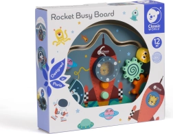 El tablero manipulativo de madera con forma de cohete de CLASSIC WORLD ofrece 6 en 1 actividades divertidas para niños a partir de 12 meses: laberinto, cuentas, rueda giratoria, botones, elemento magnético y perillas giratorias. Favorece la motricidad fina, la coordinación ojo–mano y la creatividad; está fabricado en madera de calidad y pintado con pinturas no tóxicas.