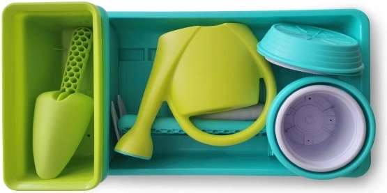 El paquete incluye macetas de varios tamaños, mini jardineras, así como una práctica regadera y herramientas, para que los niños puedan sembrar, trasplantar y regar como auténticos jardineros.