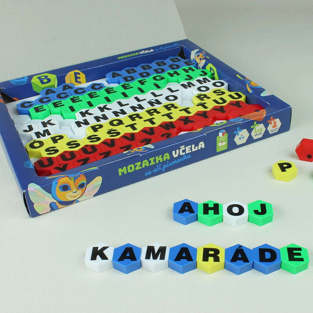 El set educativo Abecedario convierte el aprendizaje de las letras en un juego. Las piezas con forma de panales de abeja se conectan fácilmente, de modo que los niños pueden crear palabras, probar combinaciones y practicar el reconocimiento correcto de letras y de signos de puntuación. Cinco colores llamativos —amarillo, rojo, verde, azul y blanco— desarrollan la percepción del color y fomentan la creatividad.