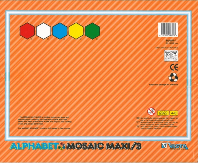 Descubre el mundo de las letras con el colorido set Alphabet Mosaic Maxi. Gracias a las piezas grandes en amarillo, rojo, verde, azul y blanco, los niños se familiarizan de forma divertida con el abecedario inglés, aprenden a componer palabras sencillas y desarrollan su imaginación y paciencia.