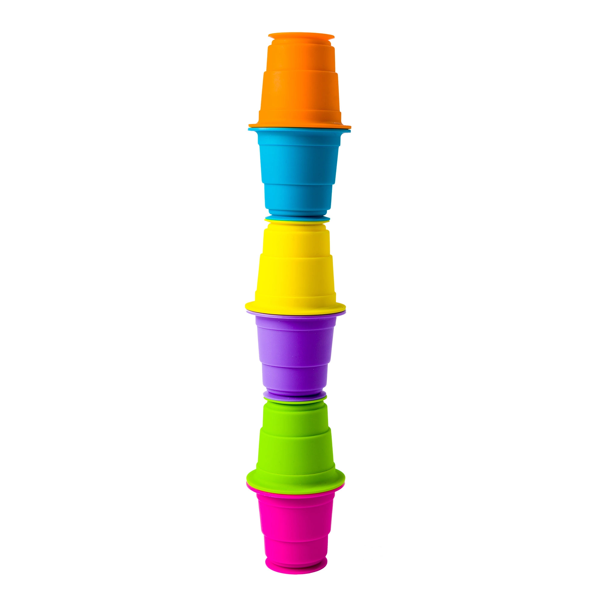 Los vasos de distintos tamaños pueden apilarse en una torre o anidarse. Los niños entrenan la motricidad fina, la coordinación mano-ojo y el pensamiento lógico.