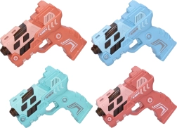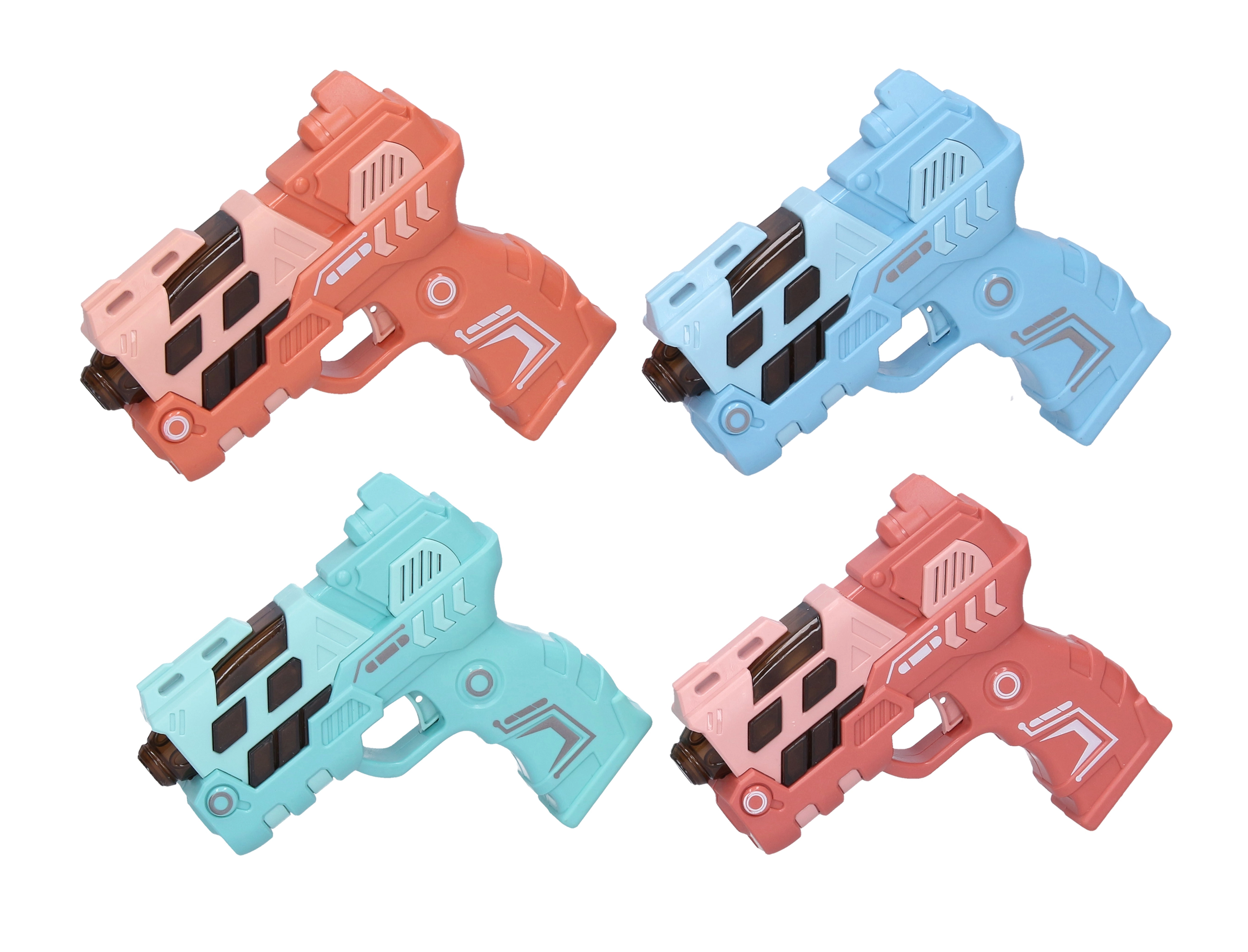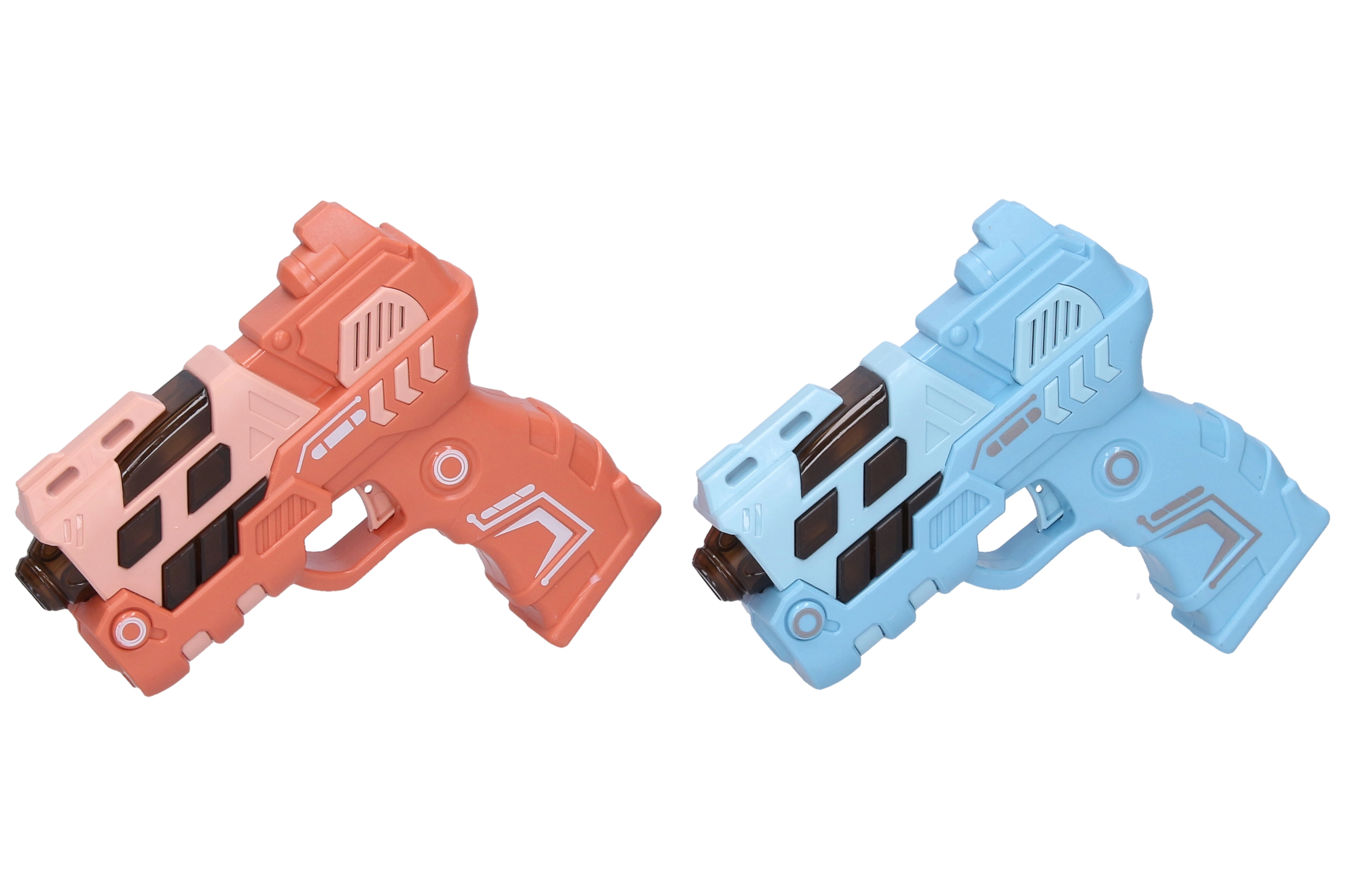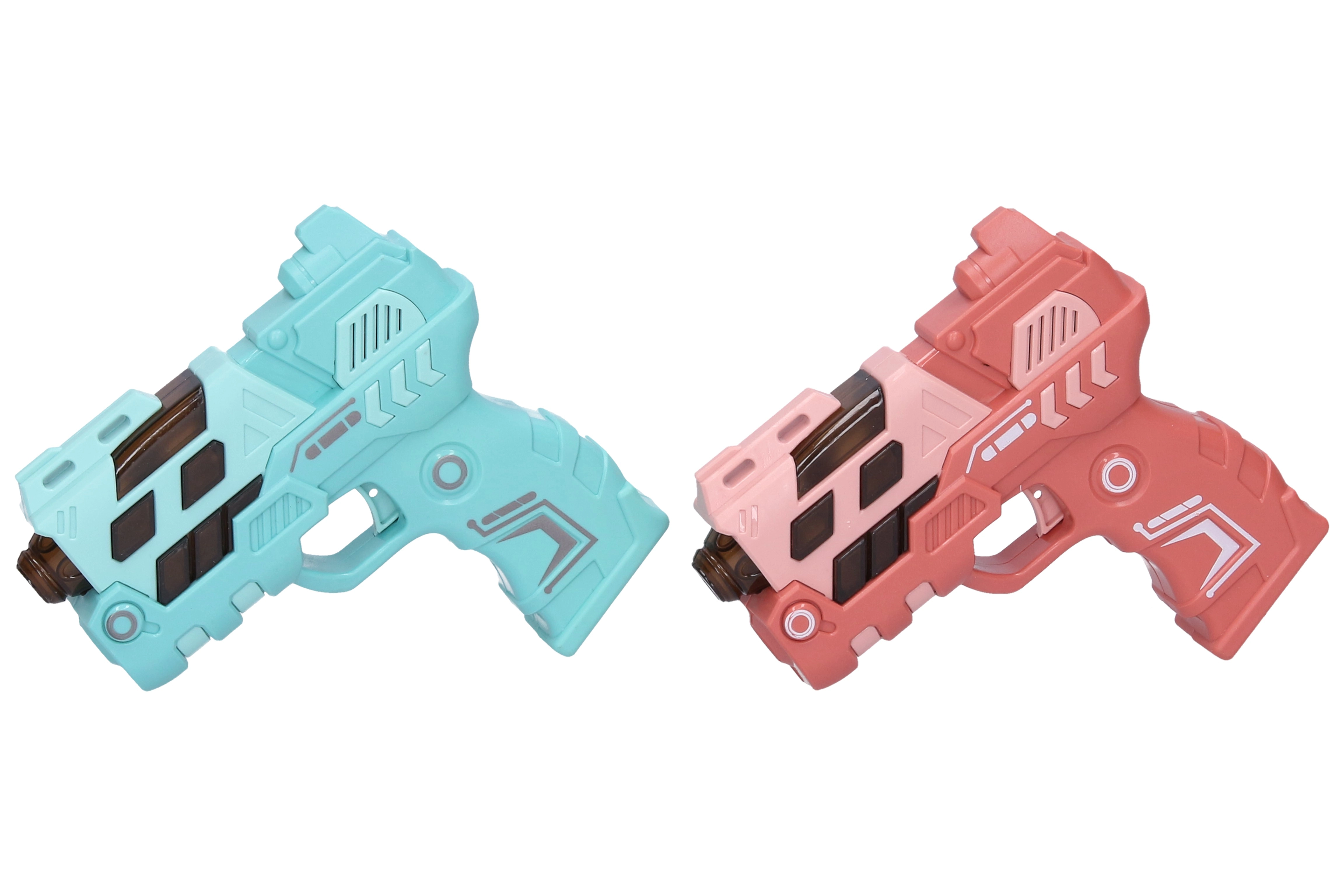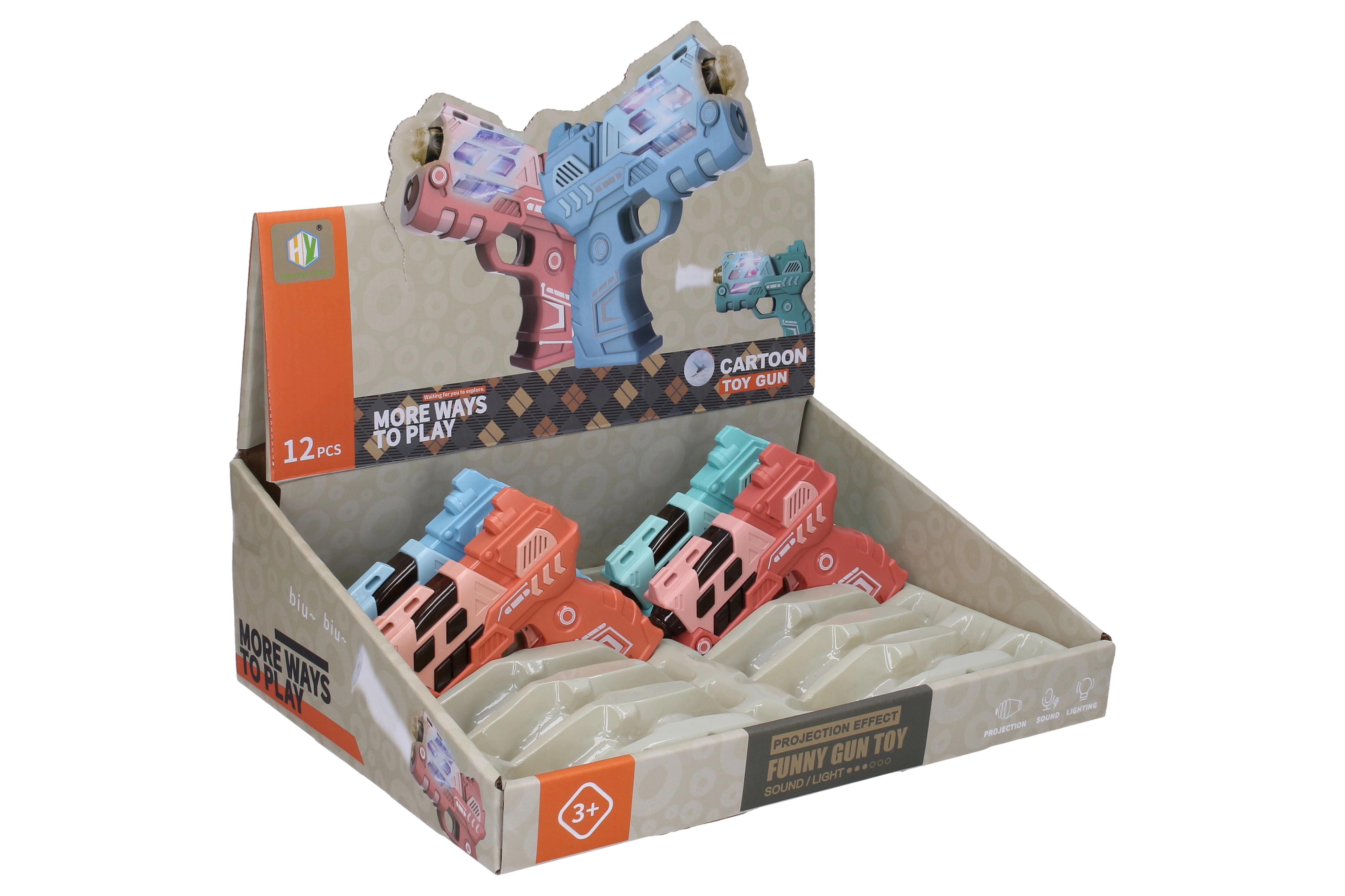 Divertida pistola infantil de 12 cm que ofrece efectos de luz y sonido y proyección de imagen para aún más acción. Disponible en 4 variantes de color (azul, verde, naranja, rosa). Alimentación con 2× AAA, no incluidas.