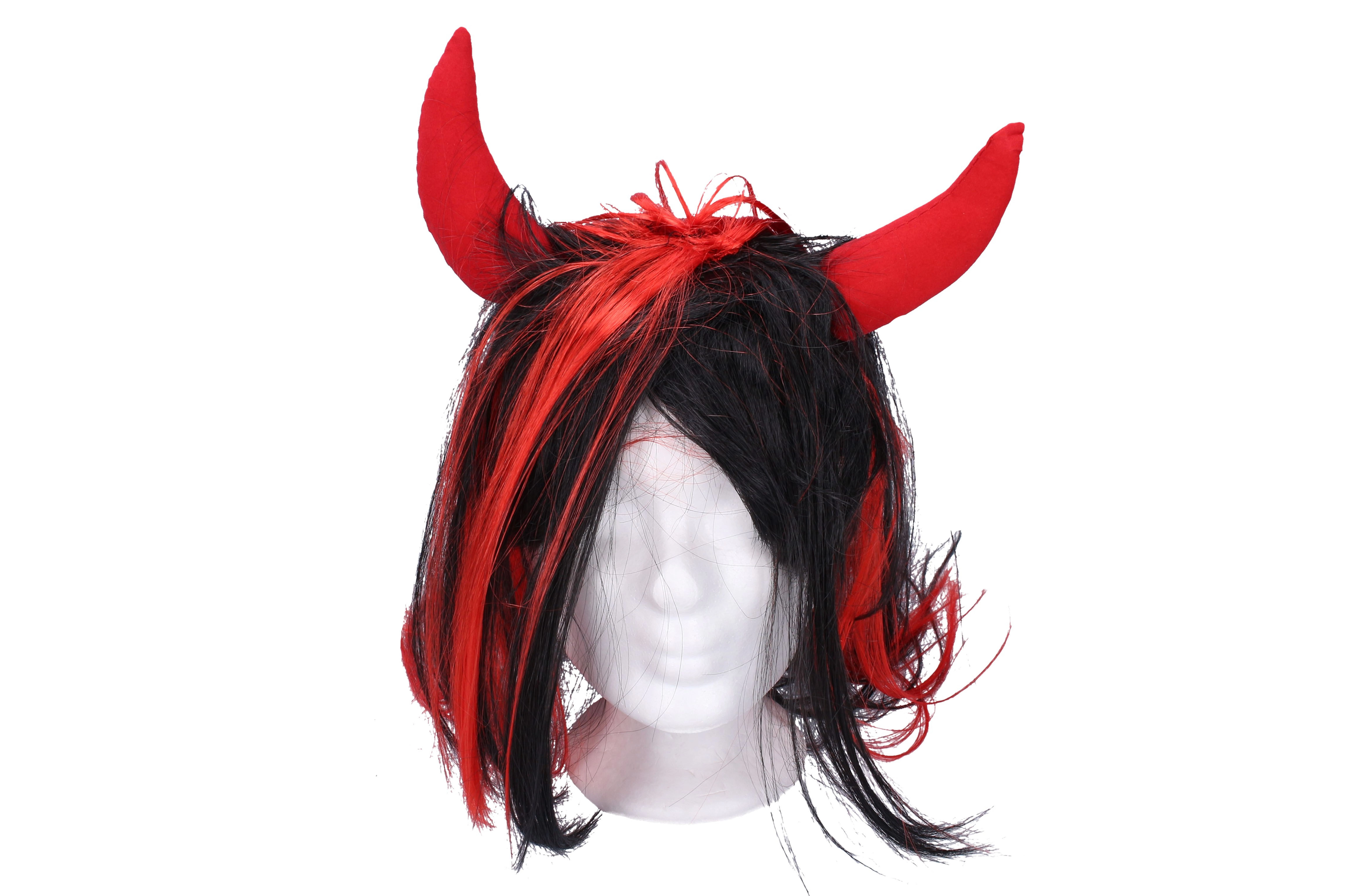 Elegante peluca diabólica con cabello negro y mechas rojas, complementada con cuernos rojos de tela. Ideal para San Nicolás, bailes de disfraces y fiestas temáticas. Fácil de poner y efecto infernal inmediato.